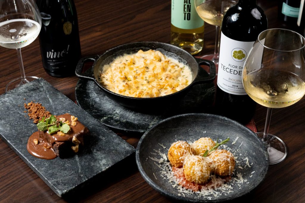Para começar, arancini de polvo com molho pomodoro, harmonizado duas taças de Alento Branco, vinho português da região do Alentejo. Seguindo o costume, o bacalhau vem no prato principal. Preparado com natas, combina com o vinho branco Flor de Tecedeiras, também português da região do Douro. De sobremesa, torta de chocolate, já que o doce não pode faltar, servido com o espumante moscatel da casa, feito na Serra Gaúcha.