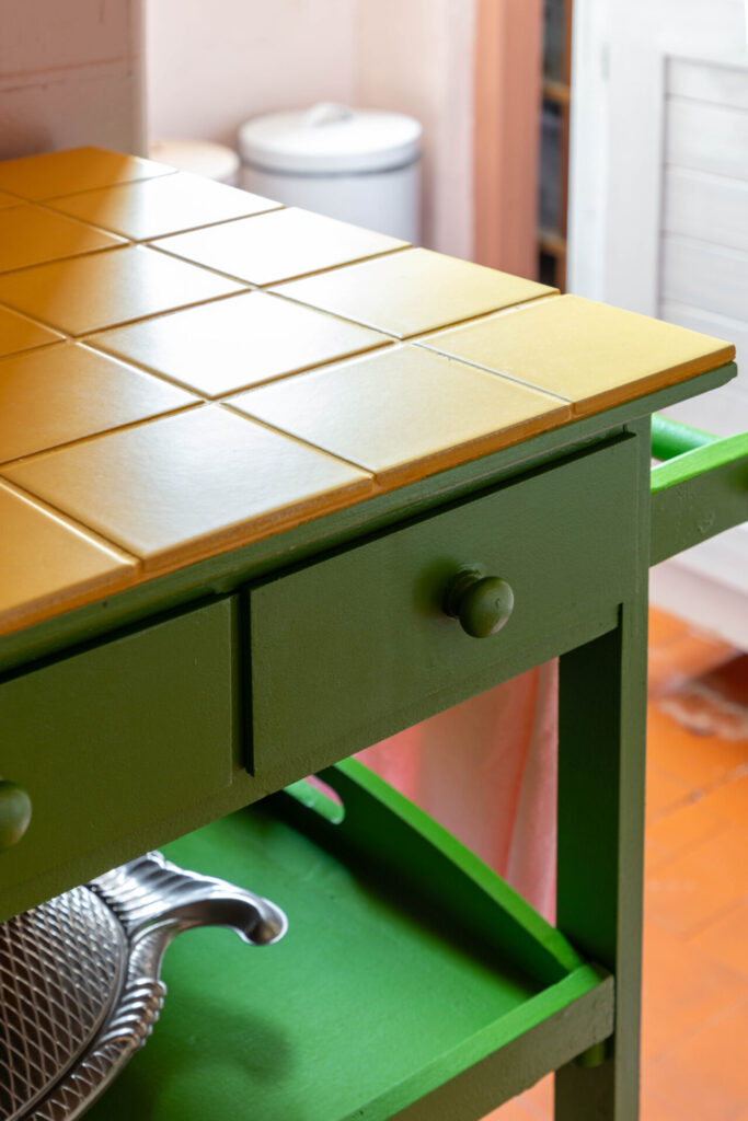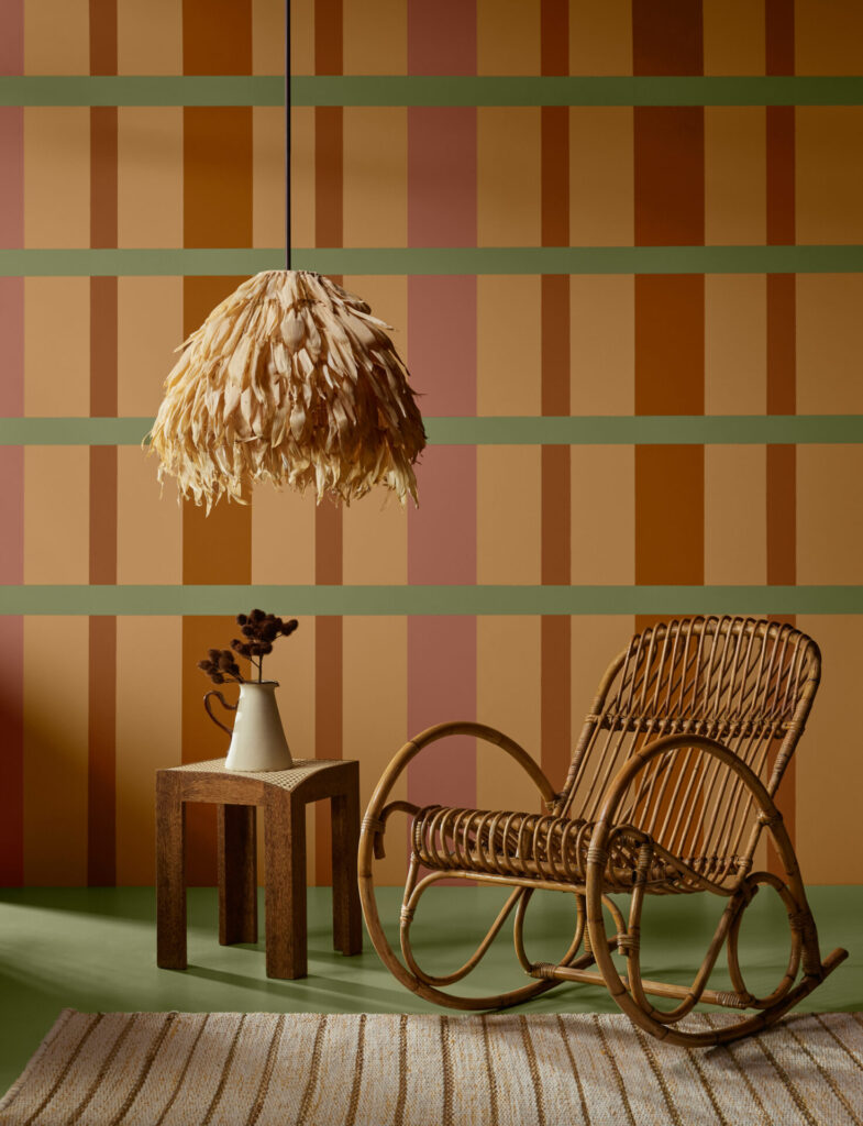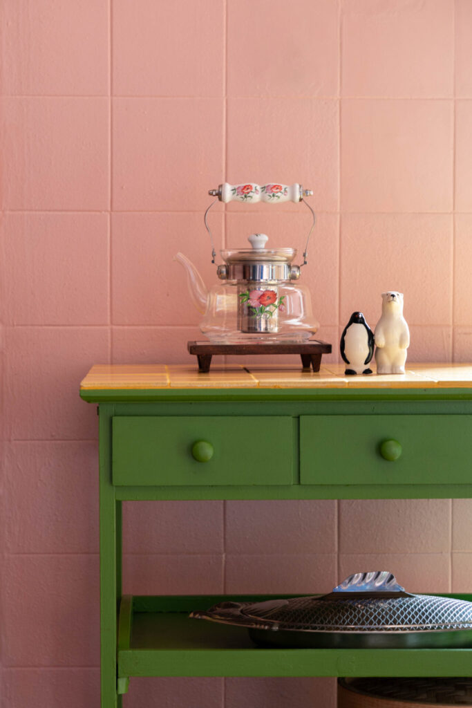 Saindo de uma atmosfera relaxante e embarcando em um visual retrô e aconchegante, a escolha do móvel pintado nas cores Limão-Taiti e Brilho Quente, em frente a uma parede pintada de Creme Cor-de-Rosa, criou um cenário autêntico e cheio de vitalidade. Remetendo a uma estética vintage, misturando o rústico com o divertido e acolhedor.