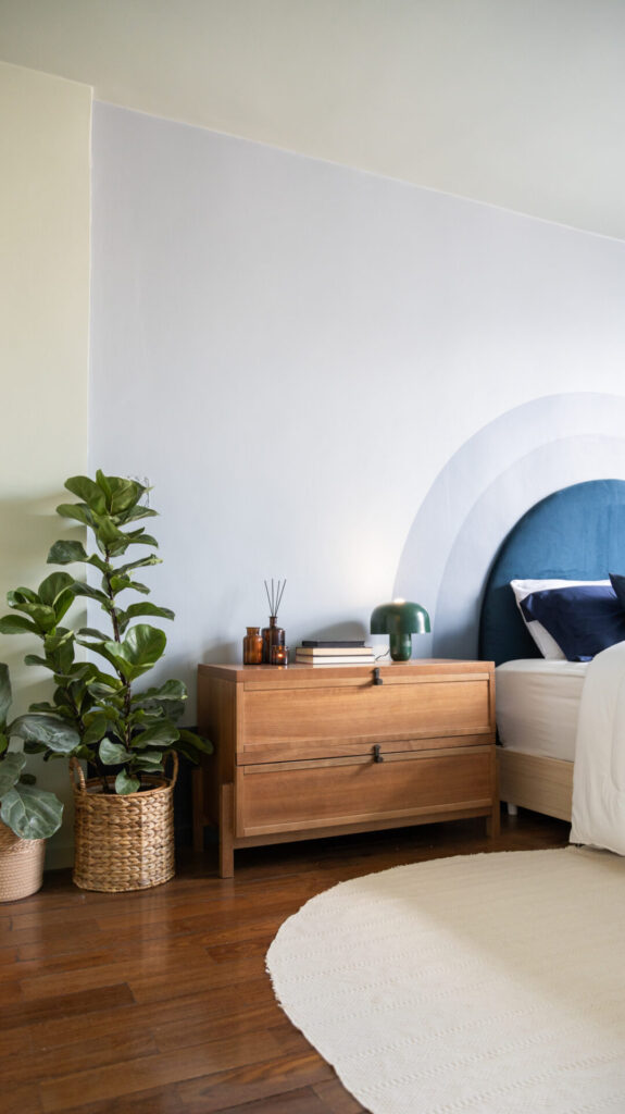 Em um mix de verde e azul, o projeto acima criou uma atmosfera calma e relaxante com o uso das cores Terra da Garoa, Sino da Igreja, Nimbus, além das tonalidades do Suvinil Revela 2024+: Fundo do Mar e Conforto (eleita a cor do ano). O detalhe do arco na cabeceira da cama, pintado em diferentes tons de azul, adiciona profundidade e torna o visual mais interessante.