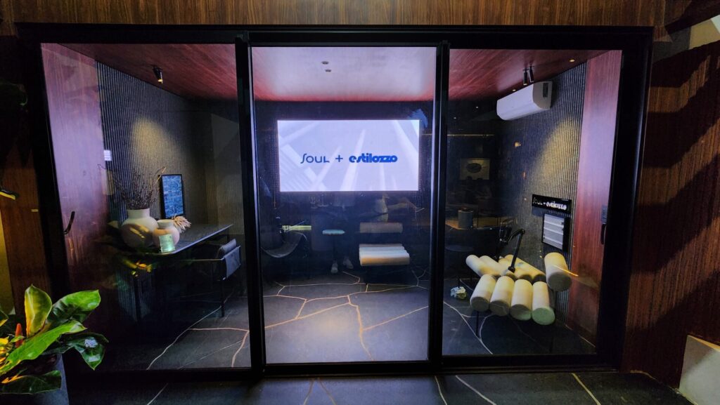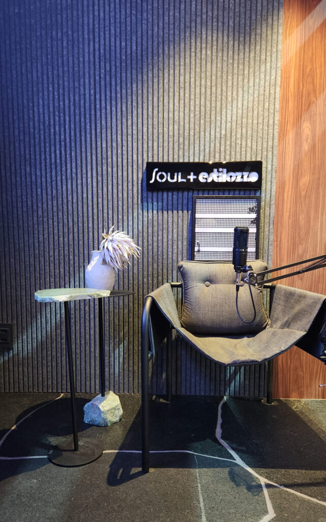 O ambiente de Flávia Nasr, batizado de Lounge Soul Brasília, utiliza a mesma técnica no revestimento acústico que cobre as paredes da sala de podcast Soul + Estilozzo.