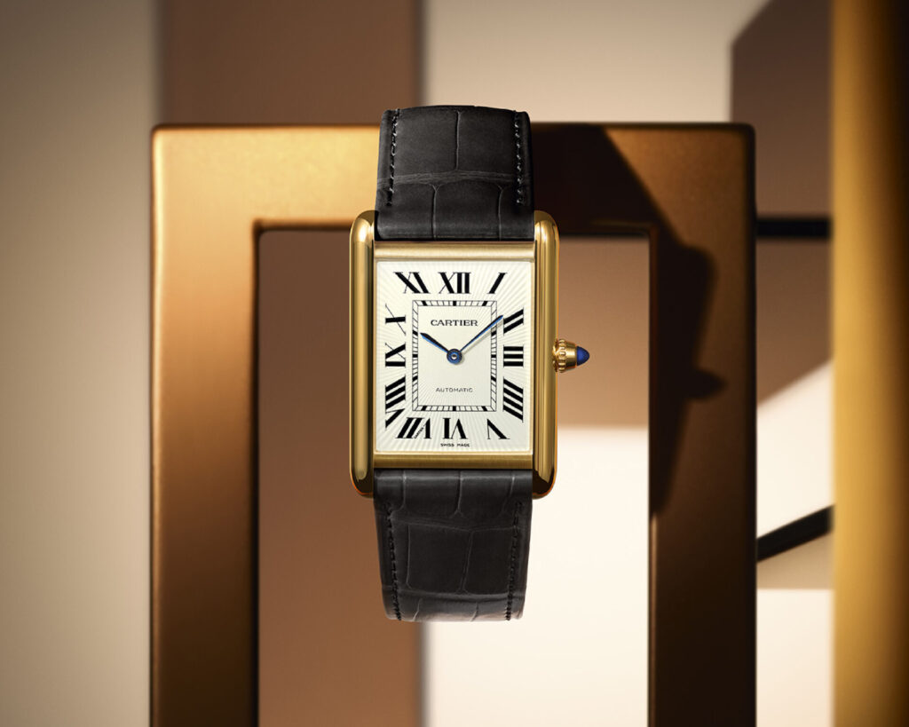 O novo tamanho LM do Tank Louis Cartier está disponível em 2 referências, em ouro amarelo e rosa, equipado com movimento automático 1899 MC.