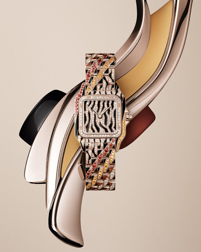 • Panthère Semi-Pavê: 4 referências de joalheria com uma nova pulseira semi-pavê. Uma animação de laço duplo semi-pavê com um mostrador totalmente pavê de diamantes também complementará o lançamento.