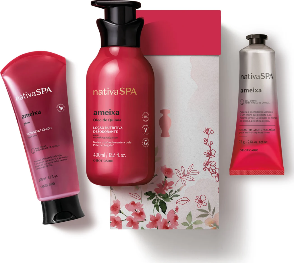 Em cuidados corporais, o Kit Presente Dia das Mães Nativa SPA Ameixa traz um momento de autocuidado completo; enquanto a deliciosa e inesquecível fragrância da ameixa, intensa e vibrante, é para cuidar de quem sempre cuidou. Já o Kit Presente Dia das Mães Cuide-se Bem Deleite, com fragrância gourmand, traz anis fresco estrelado na saída, aliado ao coração com frésia, flor de caramelo, orquídea, marshmallow de ouro, chantilly e vanilla. Por fim, a base é composta por benjoim, sândalo, ambrette, creme de baunilha, cedro cremoso e fluffy musk.