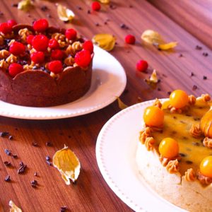 Para sobremesa Torta de Maracujazinho Pérola do Cerrado, maracujá doce e phisallis e Torta de Chocolate 60% (Bruskel) com framboesas, recheio de doce de leite com coco e nibs de cacau. Os valores são R$80 (500g) e R$150 (1kg).
