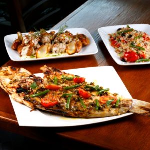 Sagrado Mar a opção é o Robalo na brasa (peixe com chimichurri de azeitonas e pimentas, batatas amassadas e cremosas e arroz Sagrado), R$ 154,00.