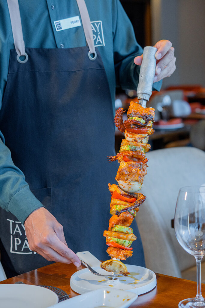 Para a data, o chef Marco Espinoza, que está à frente da cozinha de casa mais tradicional de gastronomia peruana da cidade, sugere um prato para compartilhar: o Espeto de Mar (R$305) com peixe, lula, camarão e polvo na brasa, acompanhado de molho de açafrão e batata ao murro com cebola, pimentão assado e alho crocante.