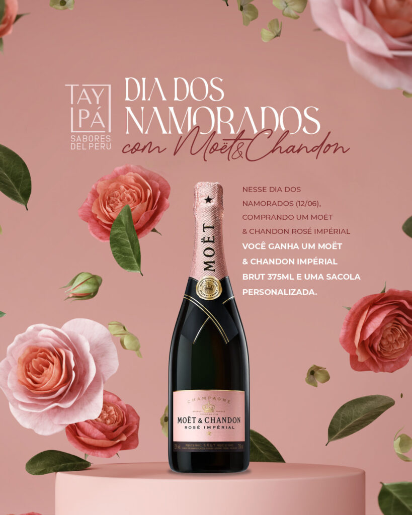TAYPÁ DEL PERU (QI 17 LAGO SUL) – No premiado Taypá um brinde especial ao Dia dos Namorados! Para celebrar o amor, ao comprar um Moët & Chandon Rosé Impérial, você ganha um Moët & Chandon Impérial Brut 375ml e uma sacola personalizada.