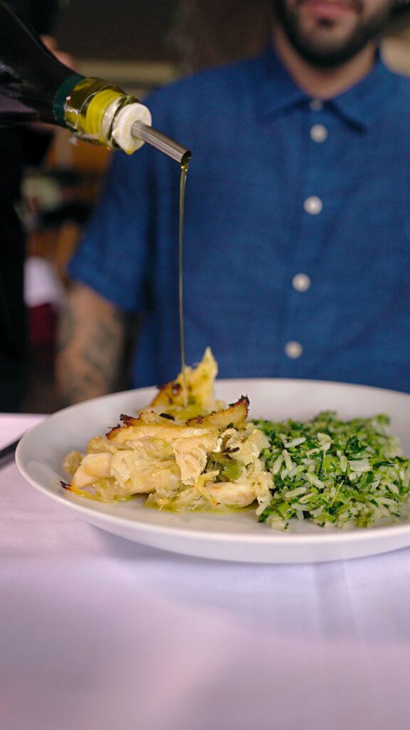 Bacalhau aromático – Criação da casa, bacalhau em lascas refogado com alho poró, talos de erva doce e cebola pérola. Finalizado ao forno, sobre cama de batatas. Prato leve e perfumado.