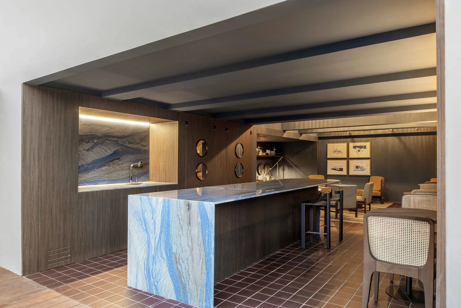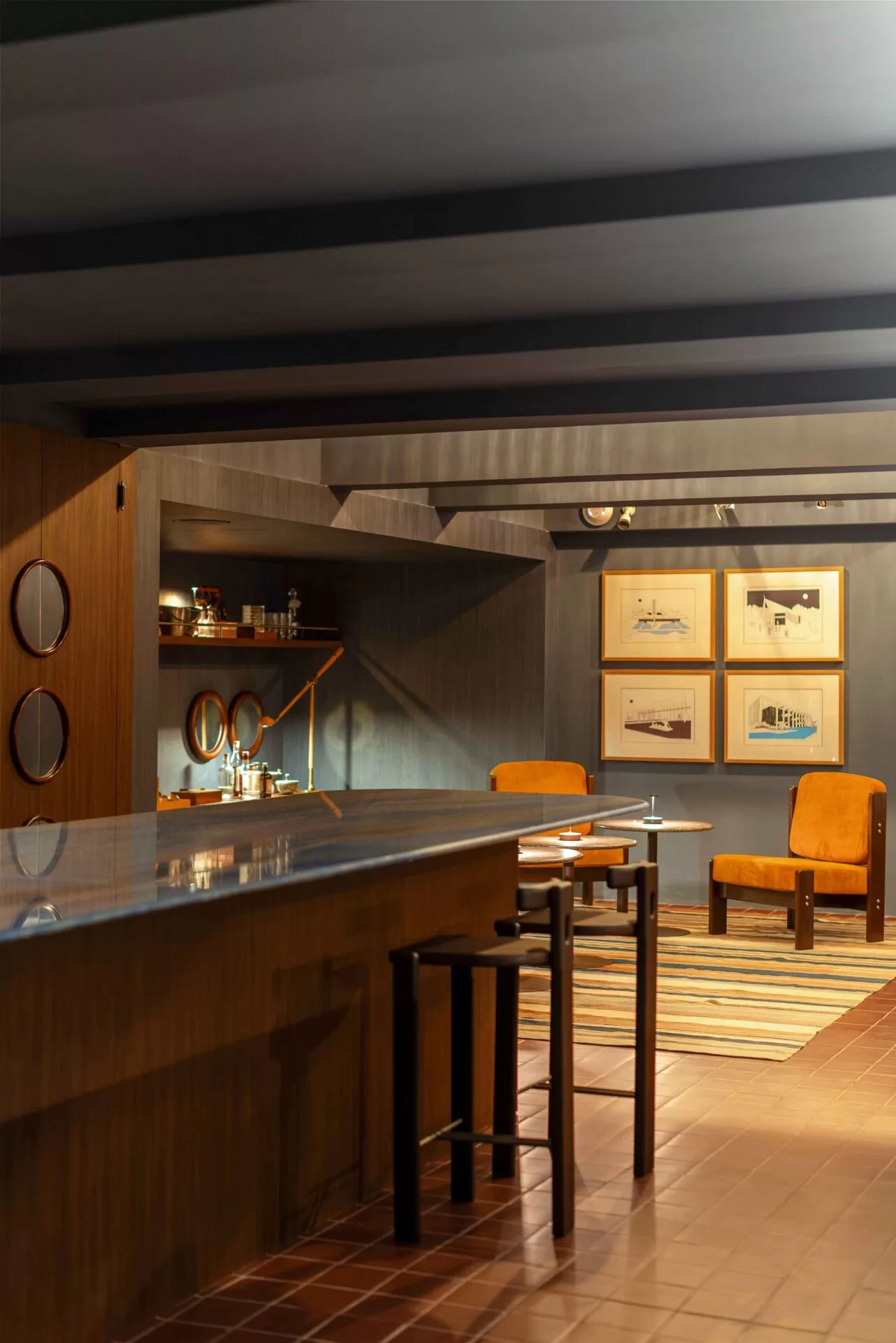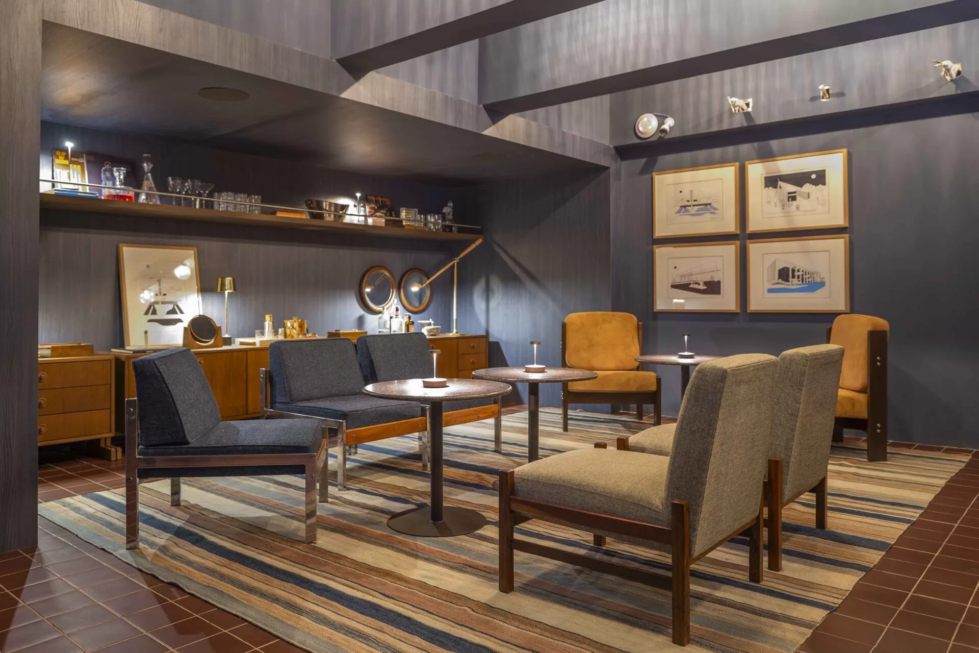 A mistura de mobiliário original dos anos 1960, garimpado em antiquários, com criações atuais de design de nomes renomados, resulta em um ambiente convidativo, cheio de história e personalidade. Destaque para a ilha do bar, com acabamento em quartzito azul, e para a poltrona Zé, a primeira criada por Felipe Zorzeto, que homenageia um mestre marceneiro e artesão. Além disso, é na mostra o lançamento do buffet Tião, um sistema de móveis multifuncionais de design versátil e inspirado no modernismo brasileiro.