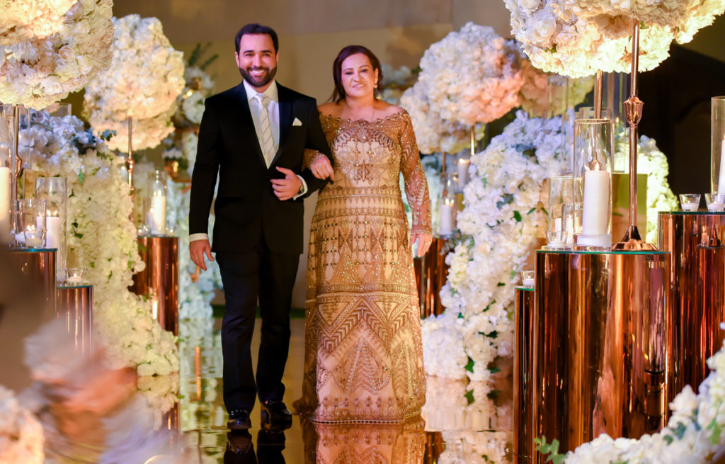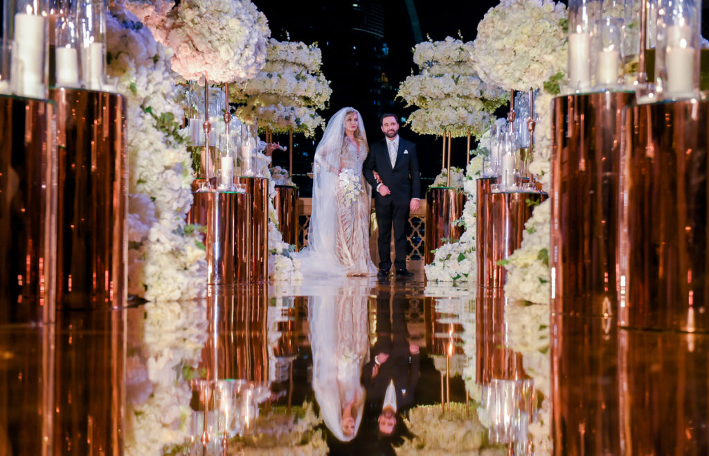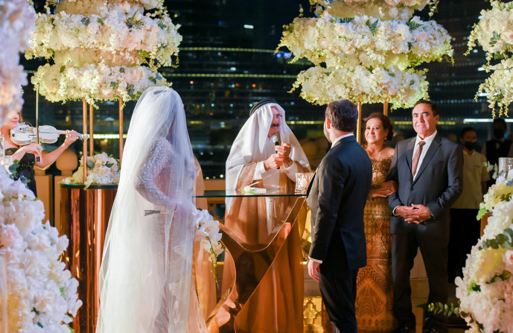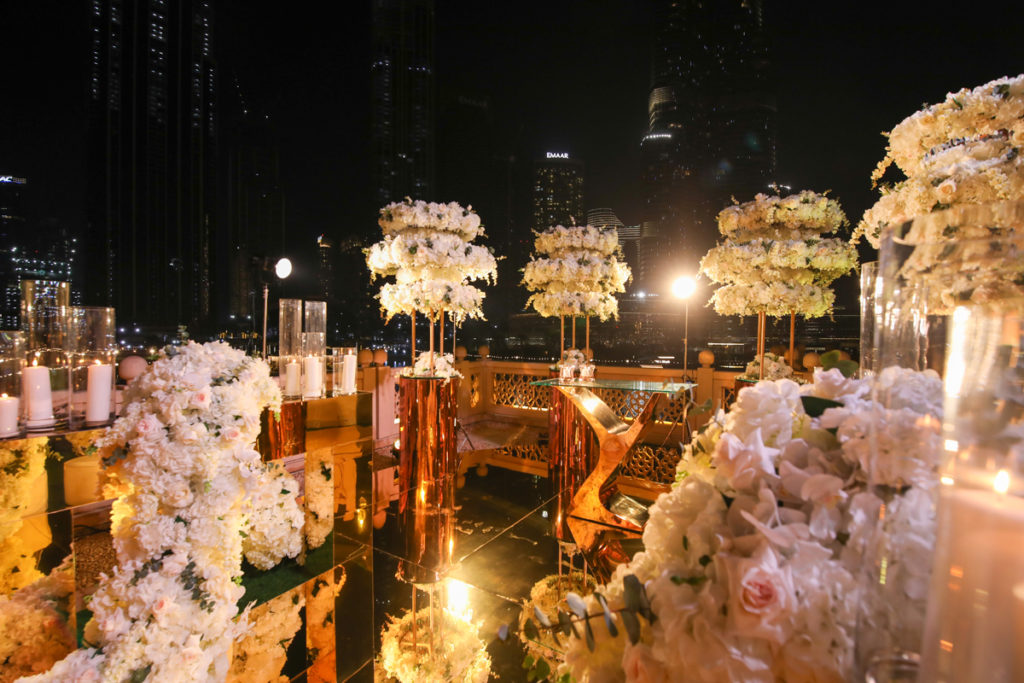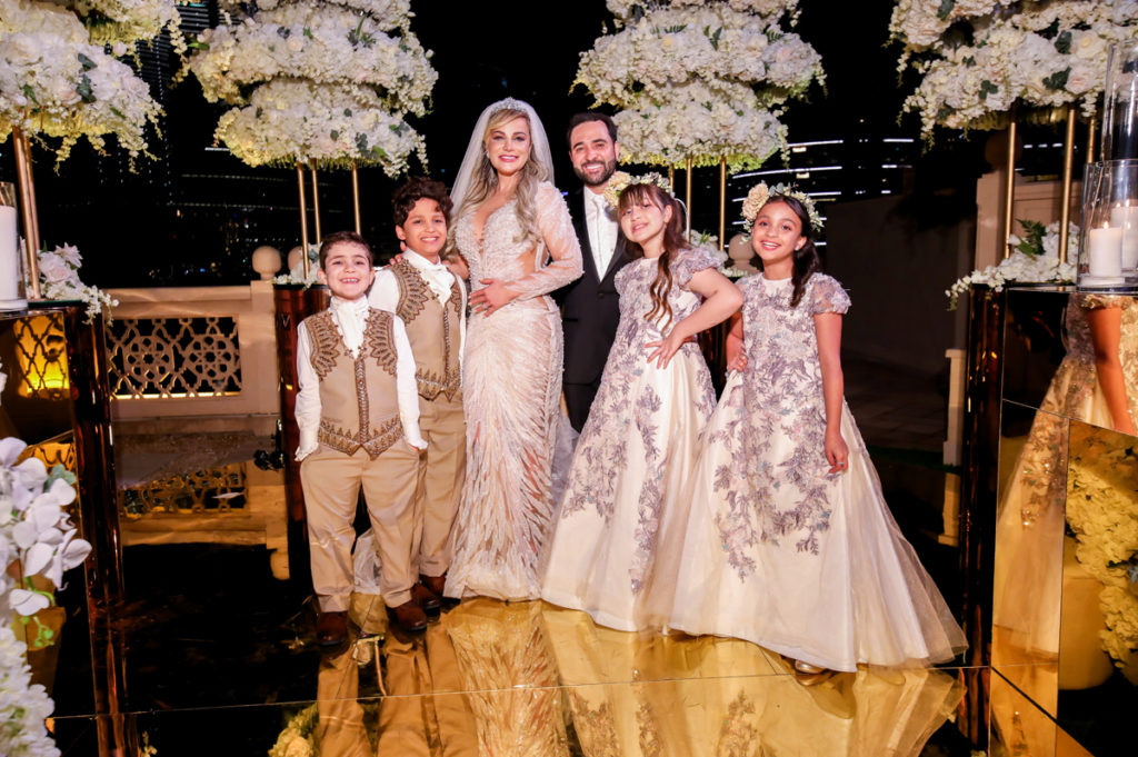 “Escolhemos o conceito luxo característico dos Emirados Árabes e um cenário deslumbrante de tirar o fôlego. A vista privilegiada para o Burj Khalifa e a Dubai Fountain, com o espetáculo das águas, serviram de paisagem apoteótica para o evento. O projeto da decoração foi pensado com um passarela gold espelhada para refletir as cores e movimentos da iluminação do mais alto edifício do mundo” , observa Kaka, que ganhou fama nacional ao assinar a decoração do casamento do cantor Gusttavo Lima com Andressa Suita.