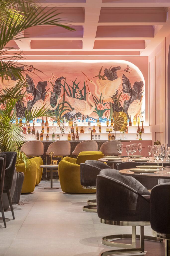 Com uma vista privilegiada para a Torre de TV em um espaço de 260m², o restaurante tem o rosa como cor predominante, tom, também, dos papéis de parede espanhóis que vestem a casa e contrastam com o verde, que se apresenta por meio do paisagismo pensado para criar uma atmosfera tropical em contraponto com a bela arquitetura em concreto do estádio Mané Garrincha.