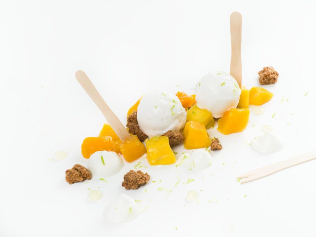 Tapas Barcelona: Helado de coco, Manga salteada,Tajin, Gel de limoncello, Crumble de coco, raspas de limão e Nata.