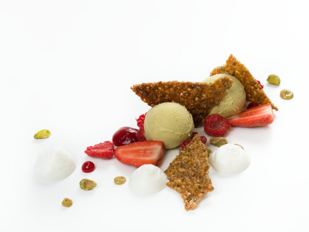 Pistache e Frutas Vermelhas: Helado de Pistache, Gel de framboesa, Nougatine de Pistache, praline de pistache, morango picado, framboesa e Nata.