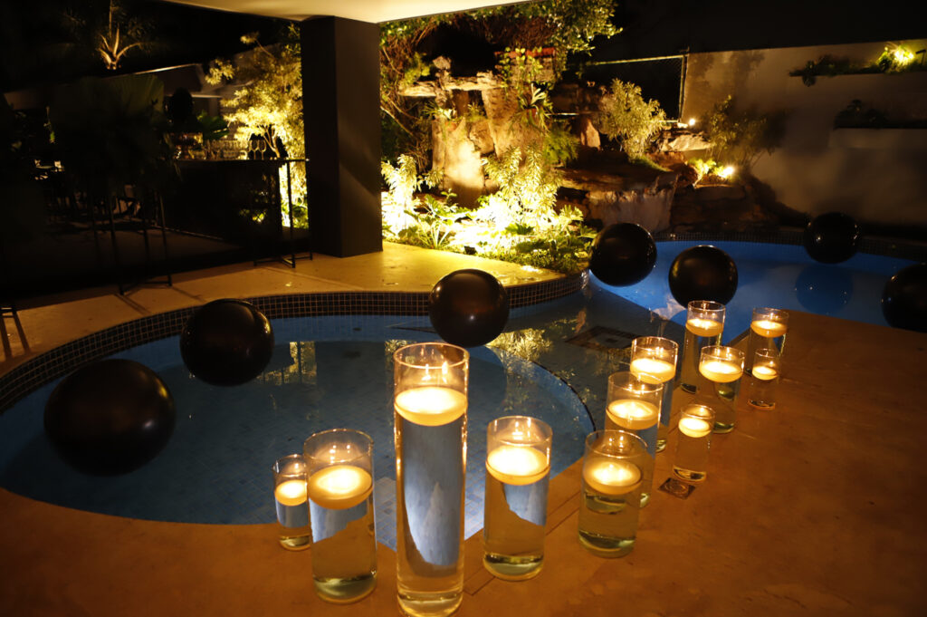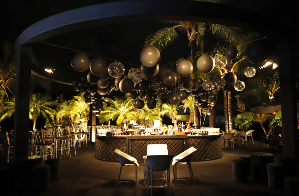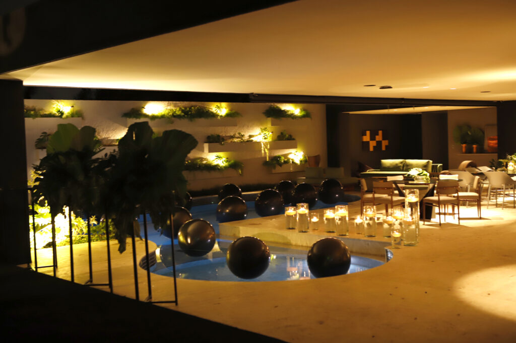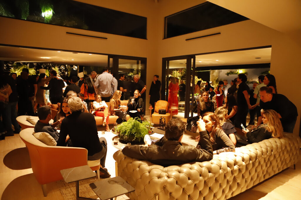 A nova residência com projeto assinado por Denise Zuba Arquitetos foi aberta para 300 convidados com ambientação da Petite Eventos, de Fernanda Leão e Renata Naoum na cor preta e folhagens tropicais.