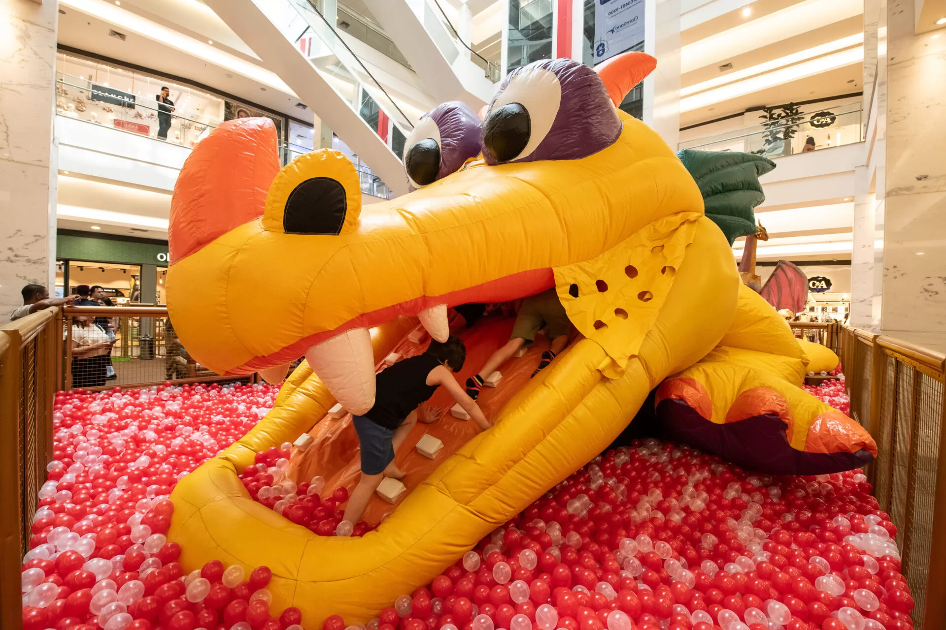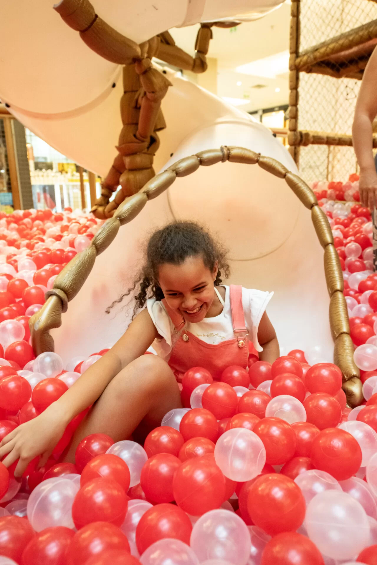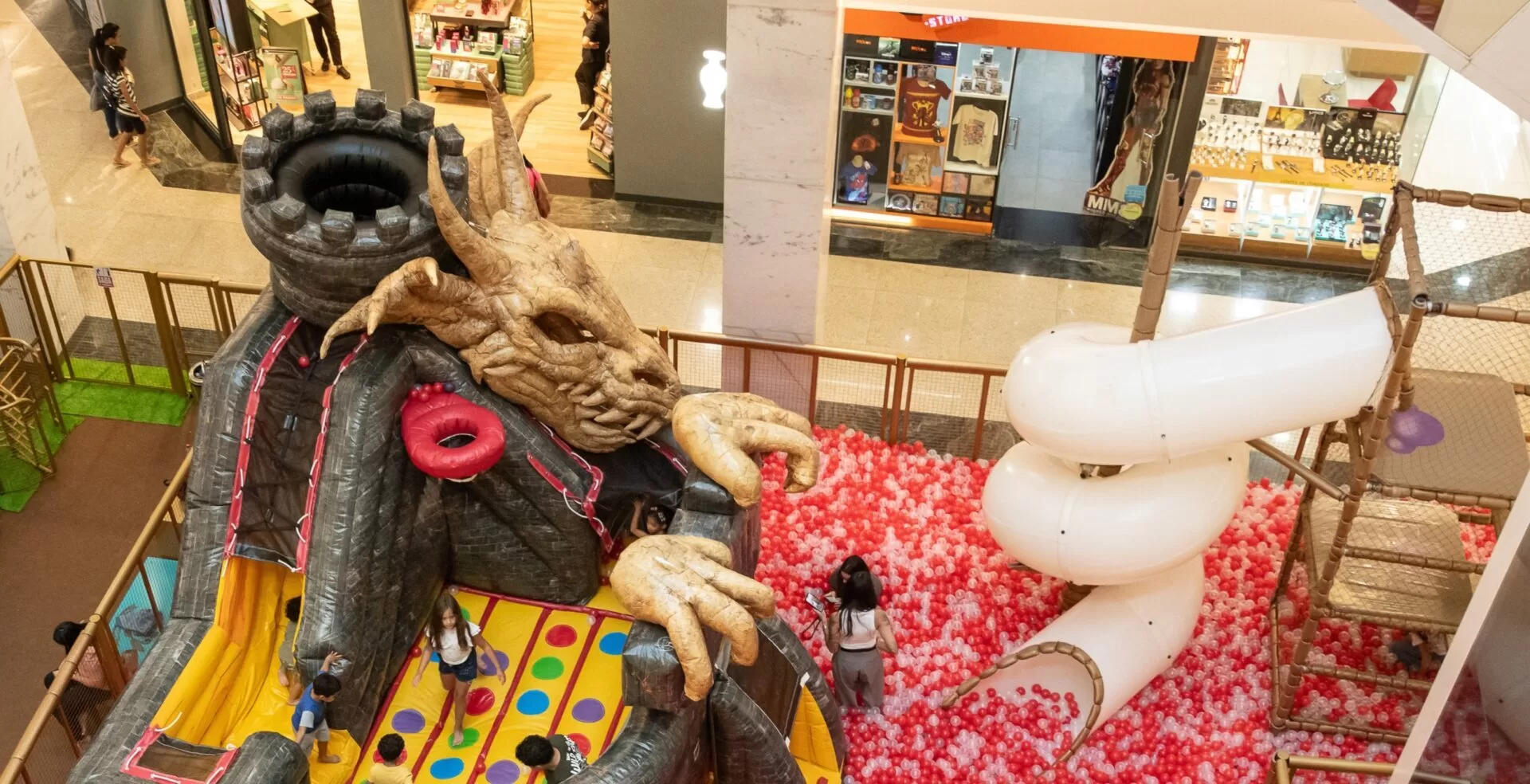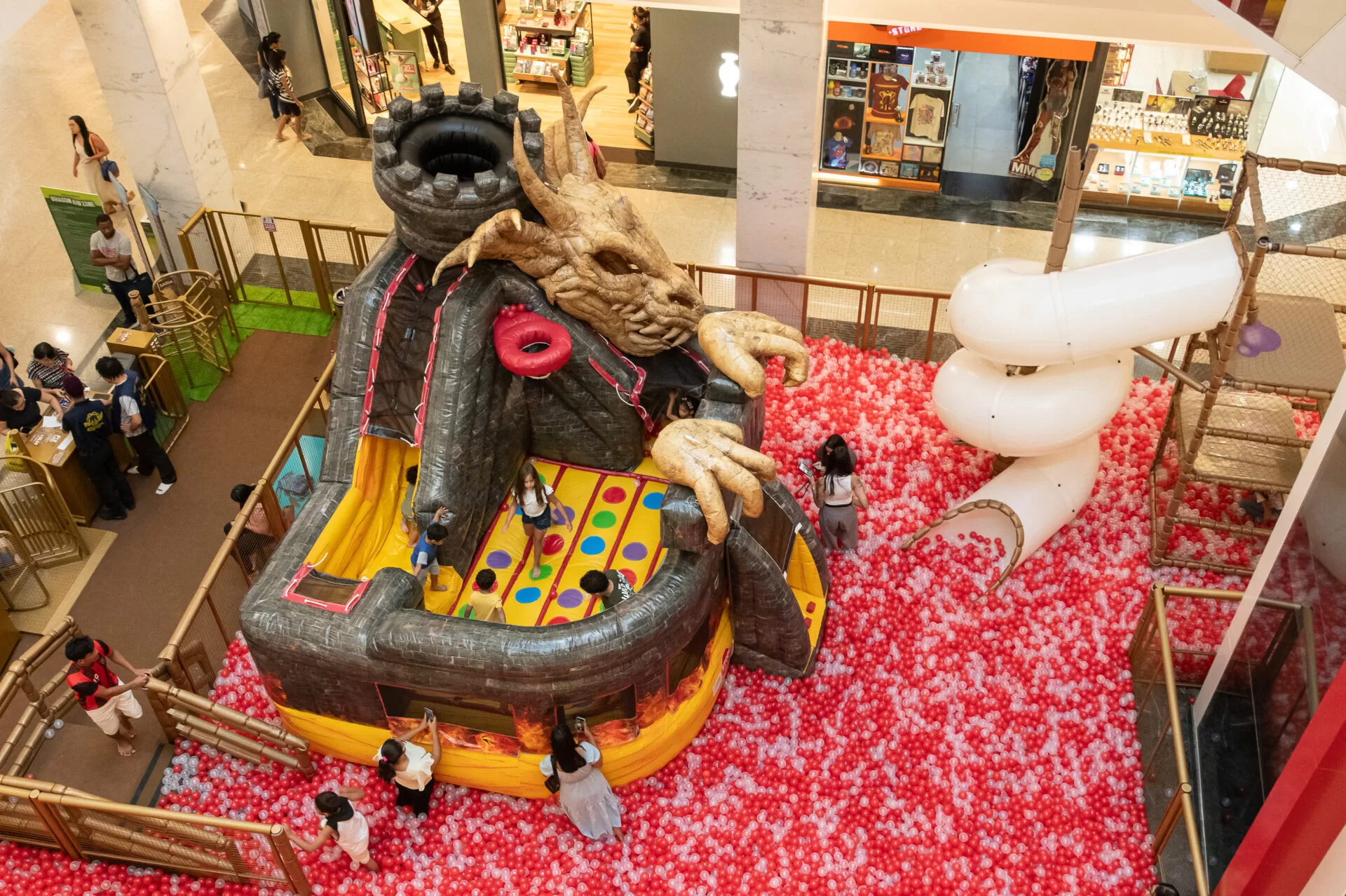 Instalado no Piso 1, o parque reúne atrações que incentivam a brincadeira livre e o convívio familiar. Dois dragões infláveis dividem espaço com uma torre equipada com escorregador, uma ampla piscina de bolinhas e um Dragão Mecatrônico, que adiciona um elemento surpresa à experiência. O ambiente foi concebido para envolver os pequenos em uma narrativa lúdica, criando a sensação de estar dentro de um universo fantástico.