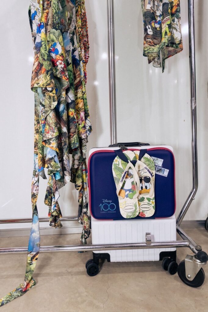 Os produtos licenciados da Havaianas com a Disney, uma parceria de sucesso que já dura mais de dez anos, também tiveram destaque na passarela. O grande protagonista foi o modelo Top Disney Classics, estampado com o Pato Donald, principal homenageado da coleção, além de outros produtos customizados com personagens clássicos da Disney. Acessórios como porta-fones de ouvido, minibags e malas de viagem compuseram o styling do desfile, além do vestido composto por chaveiros de minichinelos, criando uma experiência visual imersiva e envolvente.