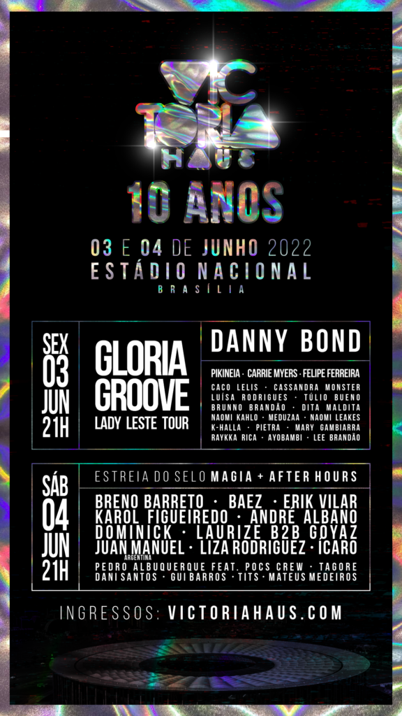 Um mega fim de semana está sendo preparado para comemorar uma década da casa. A boate vai levar ao Estádio Nacional Mané Garrincha dois eventos que além de comemorar o aniversário, abrirão o mês do Orgulho em Brasília. Tanto sexta quanto sábado o festival começa às 21h. Os ingressos são vendidos pelo site www.victoriahaus.com.