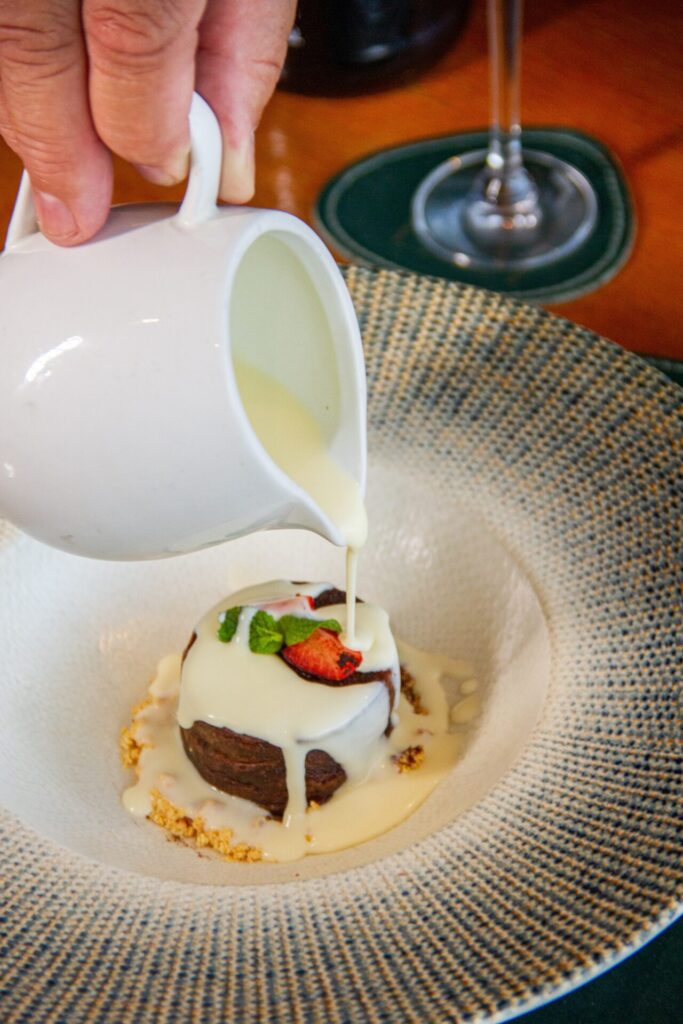 Bolo quente de chocolate com sopa fria de chocolate branco com laranja
