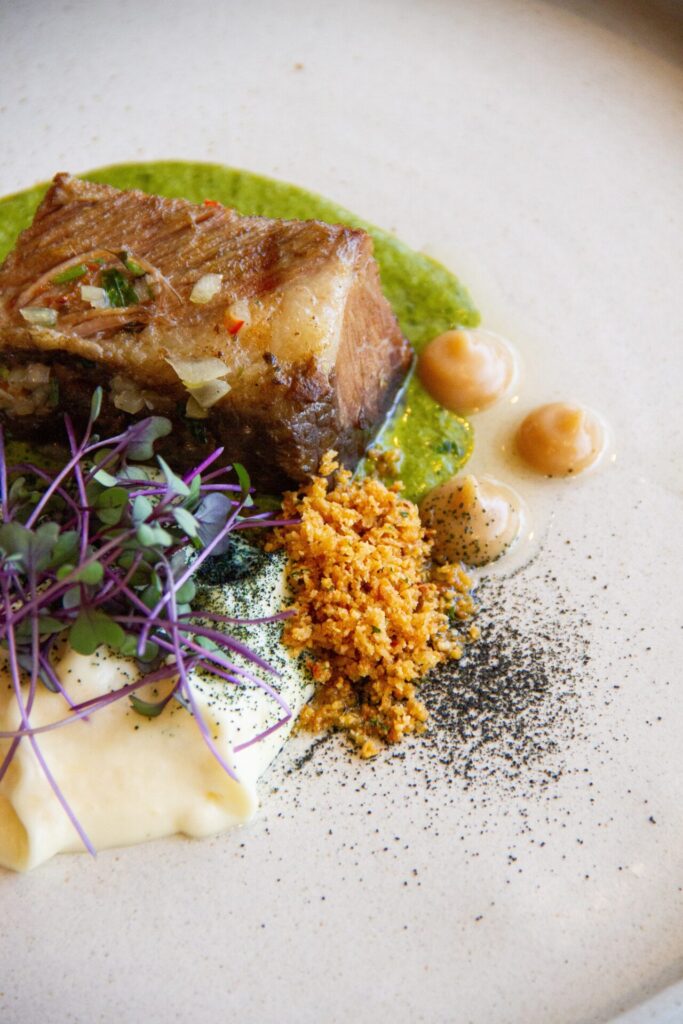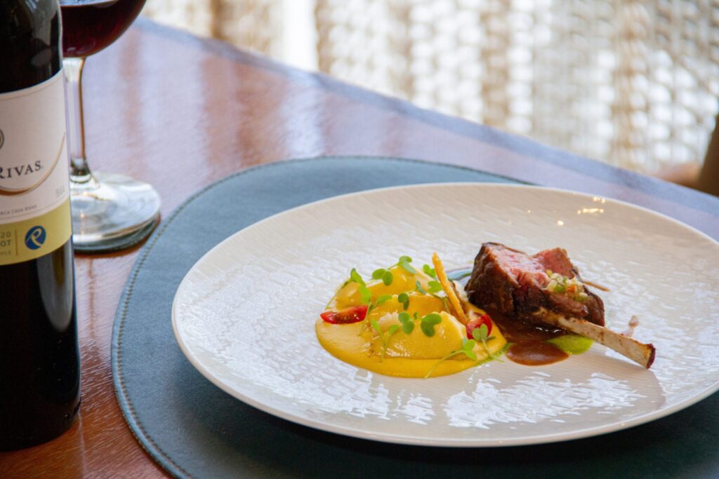 Carré de cordeiro na brasa com agnolotti de milho e queijo