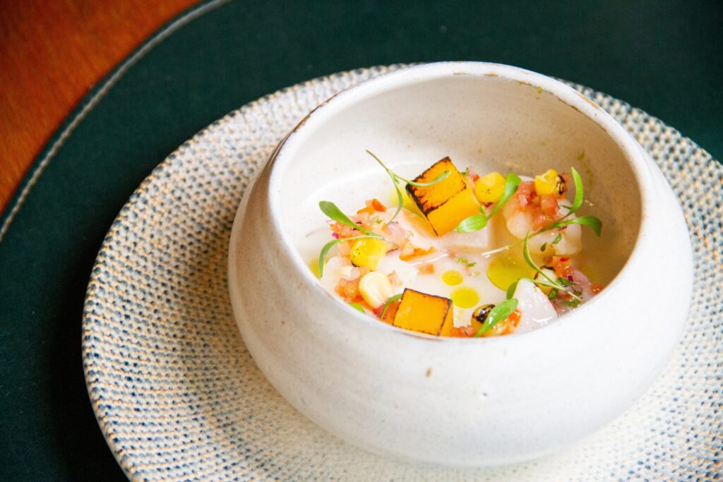 Ceviche de camarão e peixe do dia com leite de tigre cremoso