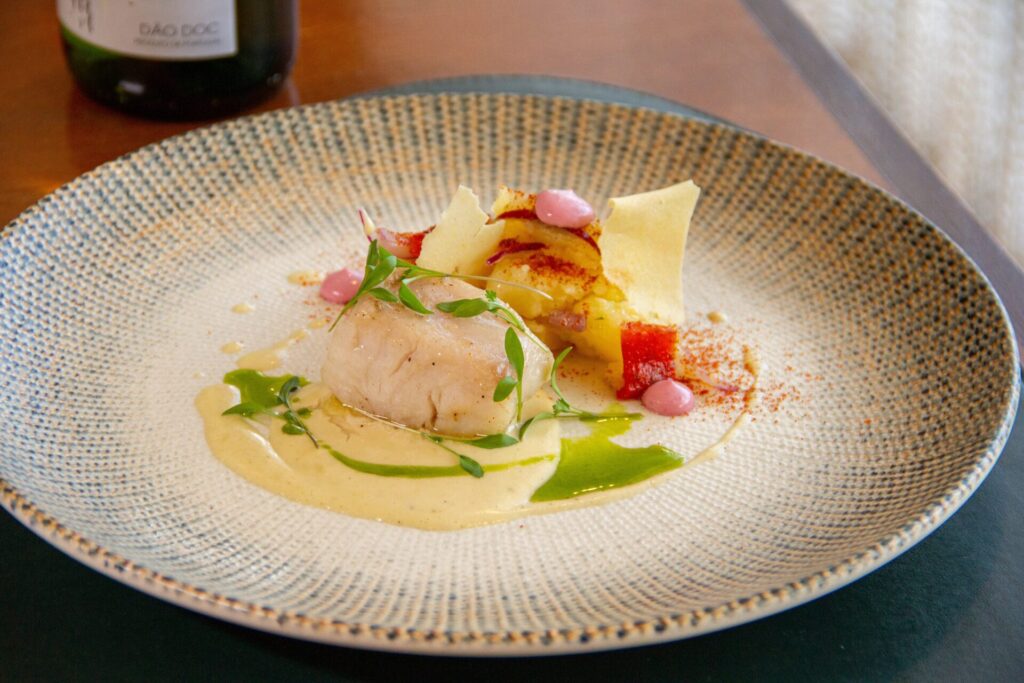 Robalo confitado, molho cremoso de anchovas e shitake com batata cremosa e Limão