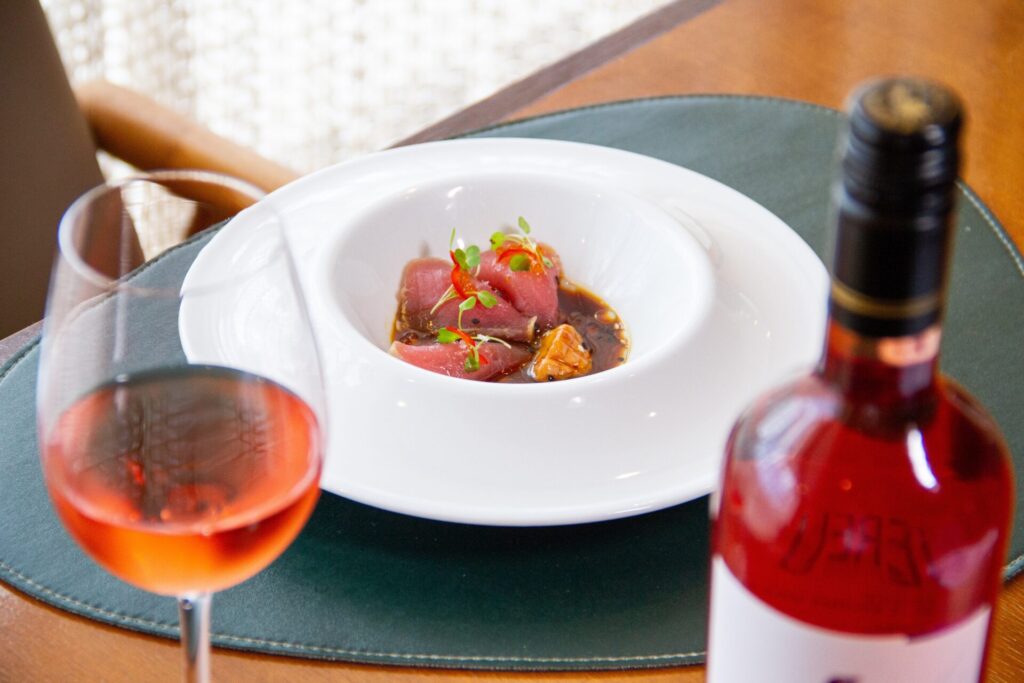 Tiradito de atum com foie gras e molho doce de pimenta amarela