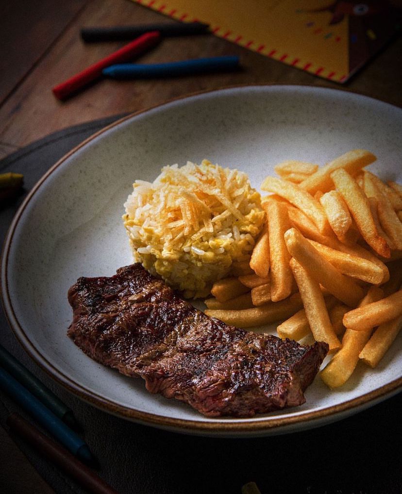 O menu kids oferece duas opções: o Prato Kids (R$ 32,00), com paillard, arroz branco, feijão e purê de batata ou fritas, e, para os pais que desejam variar um pouco, há também um sanduíche, o X-Burger Kids (R$ 29,00), montado com pão, carne e queijo cheddar.