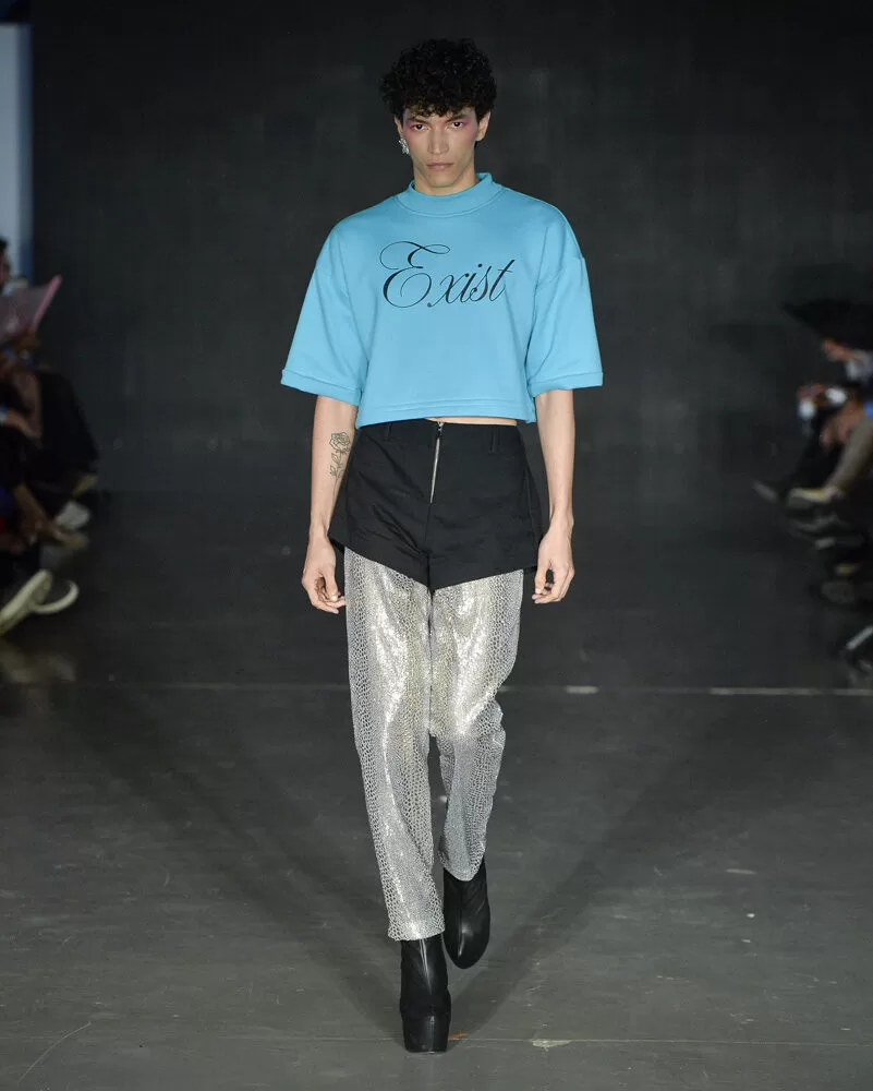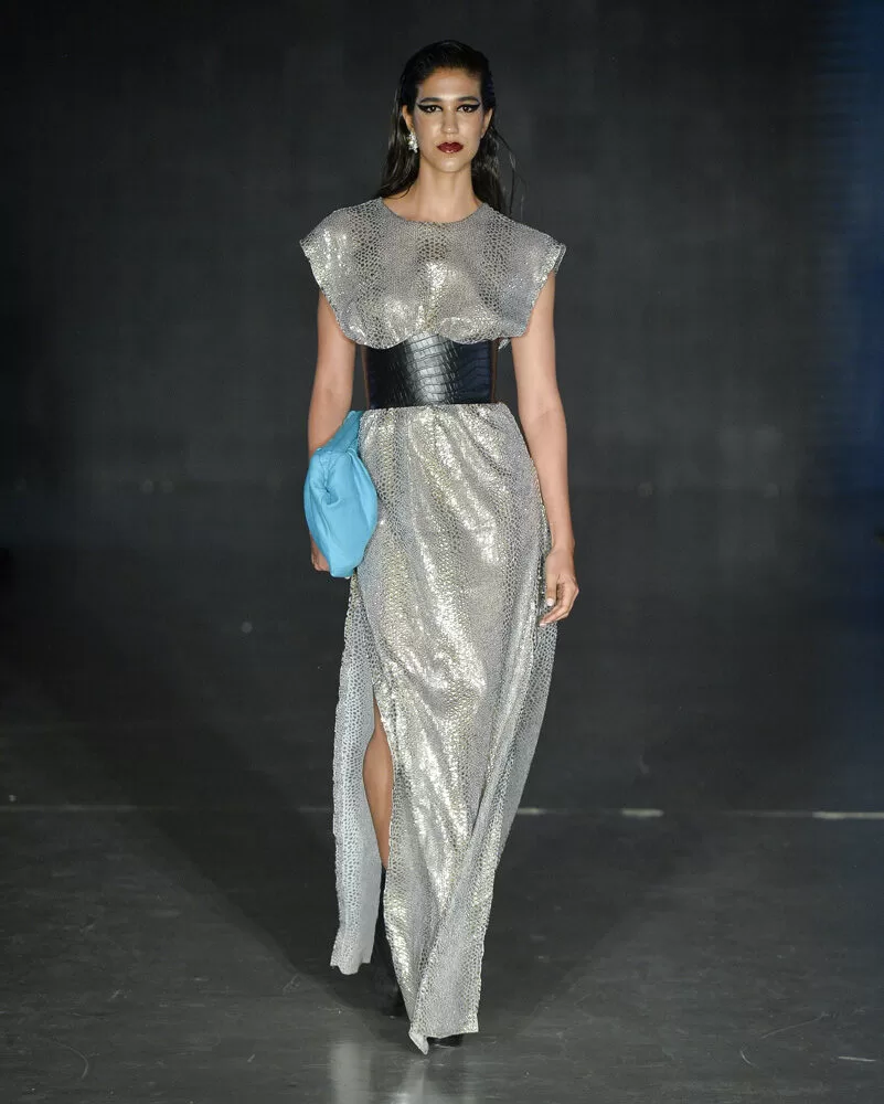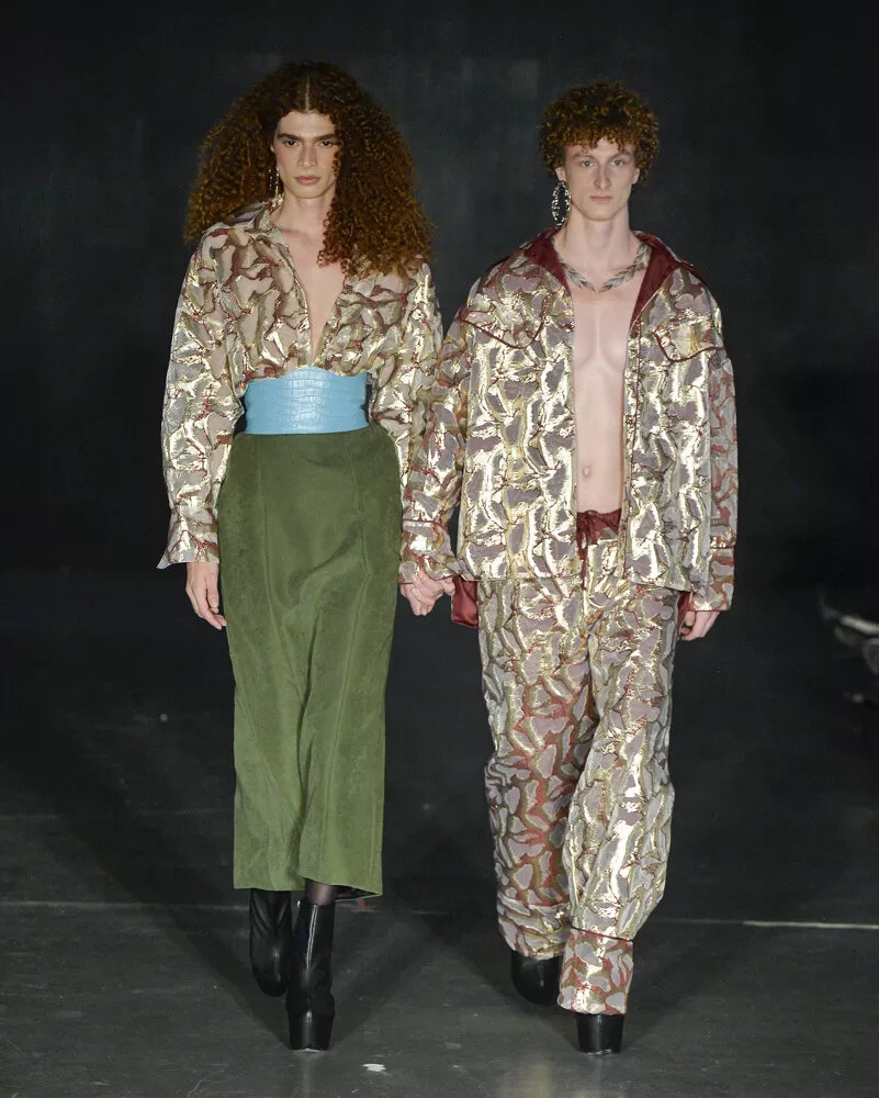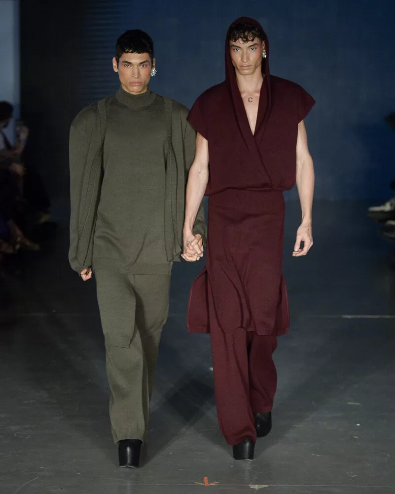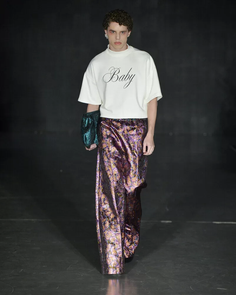 As silhuetas propostas por Vinnicius Afonso reforçam a fusão entre passado e futuro. Peças agênero, volumes ousados, blazers oversized, comprimentos midis e longos, além de cinturas marcadas, criam um percurso visual que celebra presença e movimento. As construções híbridas refletem a filosofia da coleção: a coexistência entre masculino e feminino, força e vulnerabilidade, rigidez e leveza.