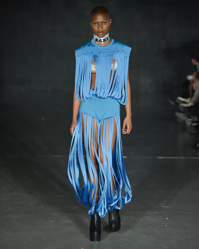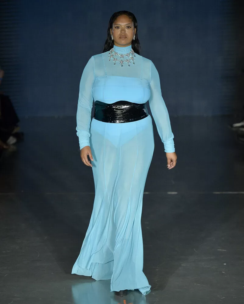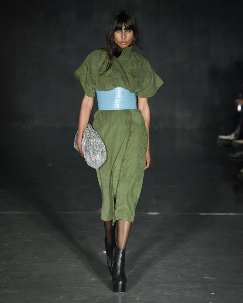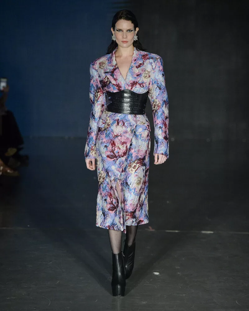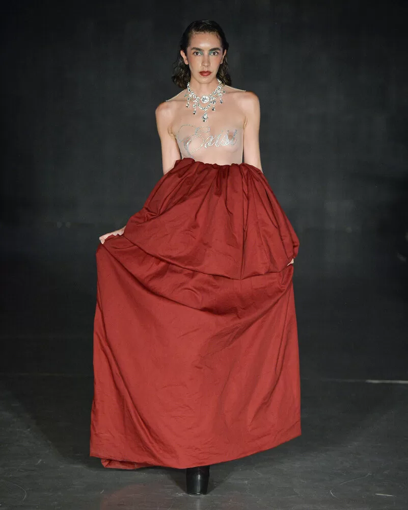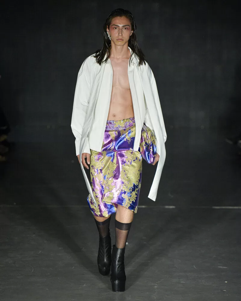 As silhuetas propostas por Vinnicius Afonso reforçam a fusão entre passado e futuro. Peças agênero, volumes ousados, blazers oversized, comprimentos midis e longos, além de cinturas marcadas, criam um percurso visual que celebra presença e movimento. As construções híbridas refletem a filosofia da coleção: a coexistência entre masculino e feminino, força e vulnerabilidade, rigidez e leveza.