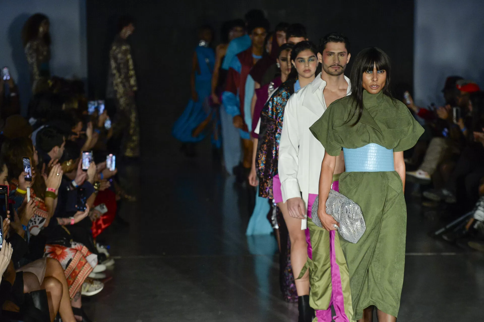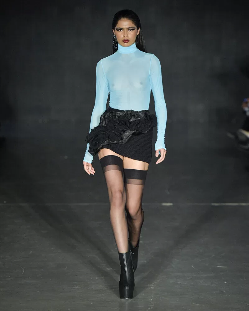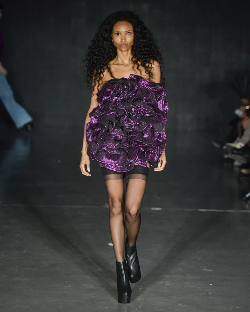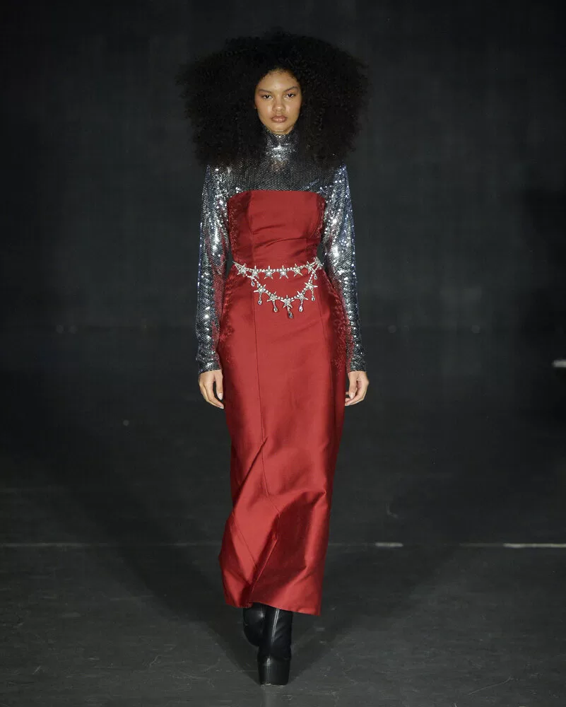 Acessórios metalizados — muitos produzidos com os mesmos tecidos dos looks — reforçam a unidade visual, enquanto botas de salto alto e plataformas ecoam a estética performática das décadas revisitadas.