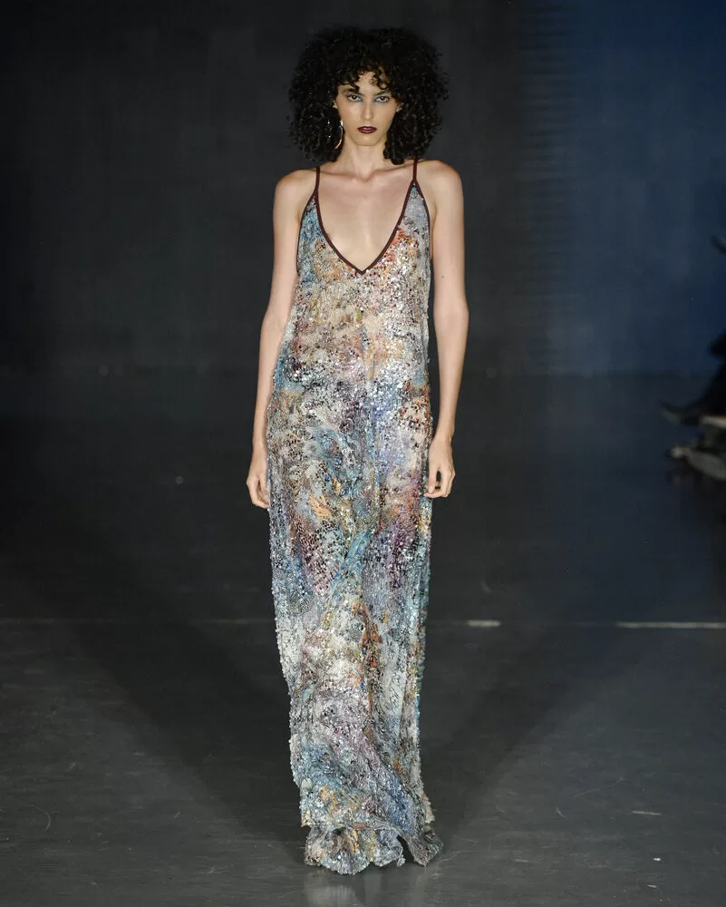 A base da coleção está na exploração de jacquards metalizados, tecidos estruturados, paetês, franjas e transparências que desenham superfícies híbridas entre rigidez e fluidez. A paleta reafirma a narrativa temporal: Turquesa, fúcsia, verde militar e bordeaux evocam modernidade; Dourado e prata remetem ao luxo atemporal; Verde elétrico e púrpura traduzem a energia glam rock; Preto profundo adiciona dramaticidade e contraste.