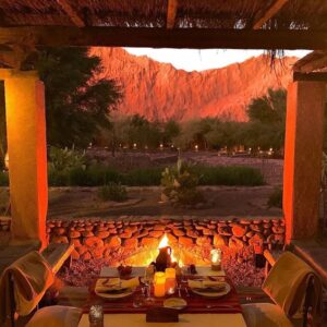 À medida que a noite cai, um dos momentos mais esperados é o jantar que harmoniza a deliciosa culinária local com bons vinhos chilenos, enquanto se aprecia o céu cheio de estrelas do Deserto do Atacama.