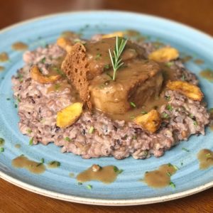 Manzo alla Birra Nera: Cupim cozido em baixa temperatura, molho de cerveja escura, arroz cremoso ao provolone, tomatinhos confit e farofa de panko.