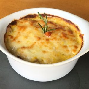 Pollo Gratin: Tirinhas de frango gratinadas ao creme de milho em cama de arroz à grega.