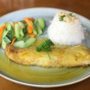 Pesce al “Ceviche” (SG) (SL): Pirarucu assado ao molho ceviche de banana em cama de arroz vermelho.