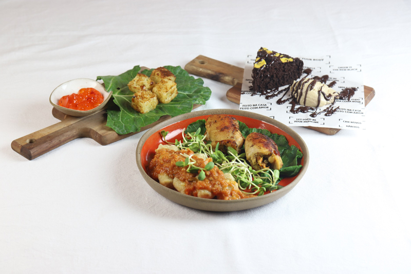 Prato Principal: sobrecoxa de frango recheada cuidadosamente com farofinha de castanhas e sementes acompanhada de gnocchi de batata doce com molho pomodoro;