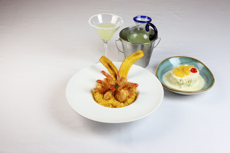 Prato Principal: Camarones Cartagena: camarões crocantes de coco acompanhados de arroz cremoso de queijo e Aji Amarillo e chips de banana.