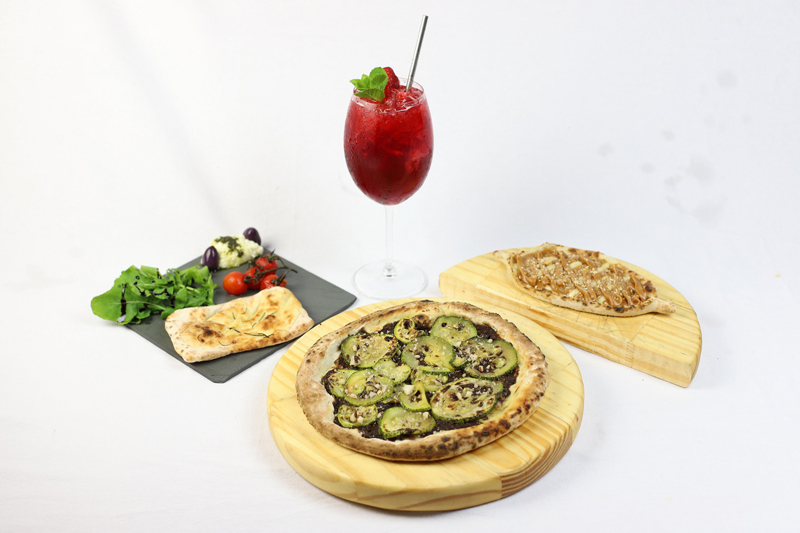 Prato Principal: Pizza Domenica: massa de fermentação 48h, pomodoro italiano, muçarela casarão, pepperoni e straciatella ou Versão vegana: Pizza funghi I zucchini: massa de fermentação 48h, ragout de cogumelos, muçarela de mandioca, abobrinhas ao forno e castanha do Pará;
