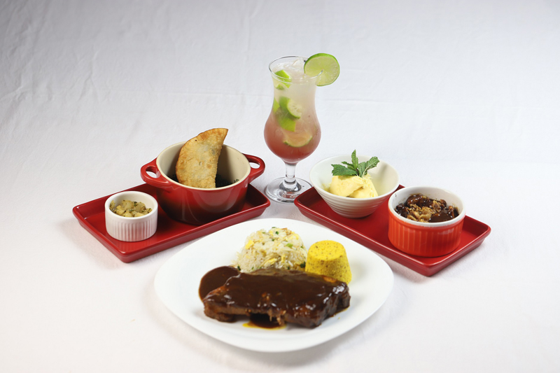 Prato Principal: Costelinha de porco flambada com cachaça, barbecue de goiaba, arroz do Chef e farofinha crocante;