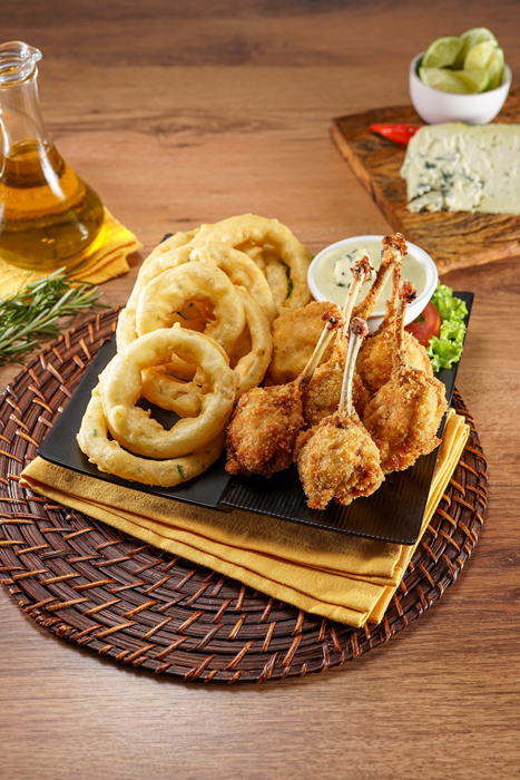 No Fausto & Manoel, Asas de frango recheadas com purê de baroa e bacon. Para acompanhar, molho de gorgonzola e anéis de cebola por R$ 46,90.