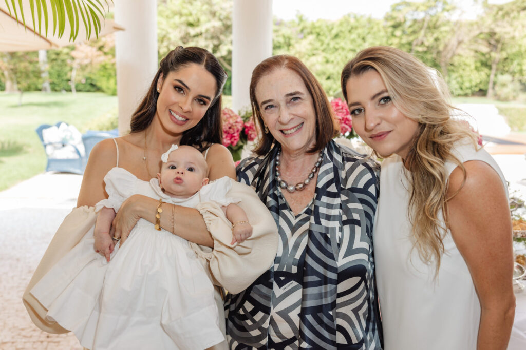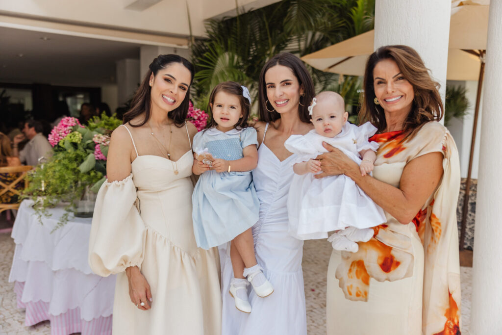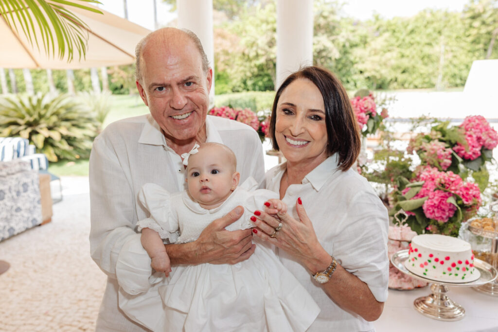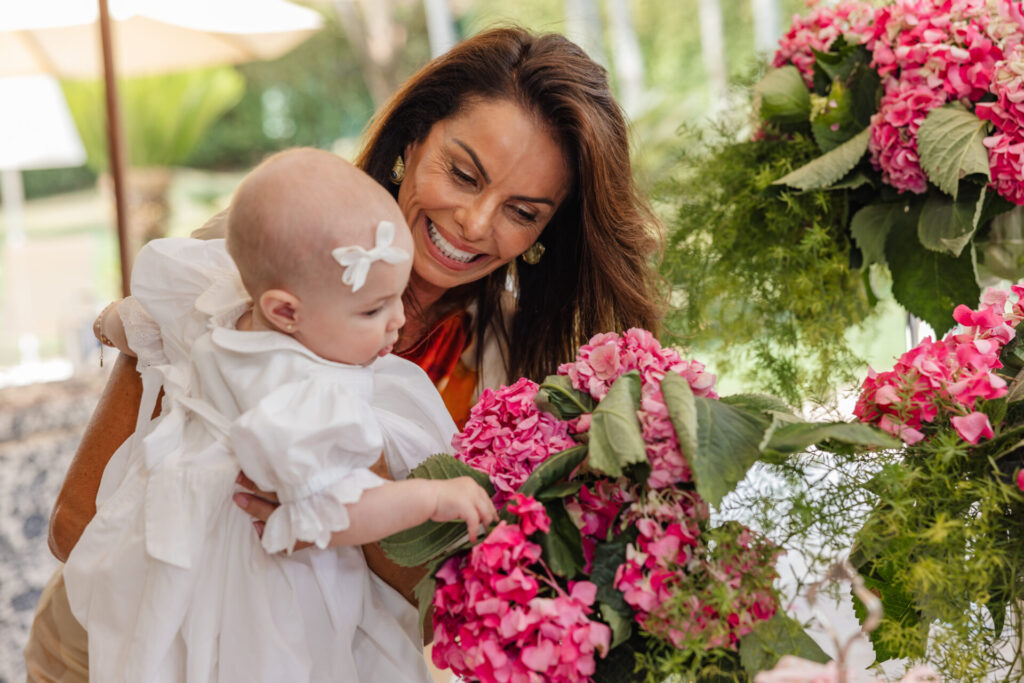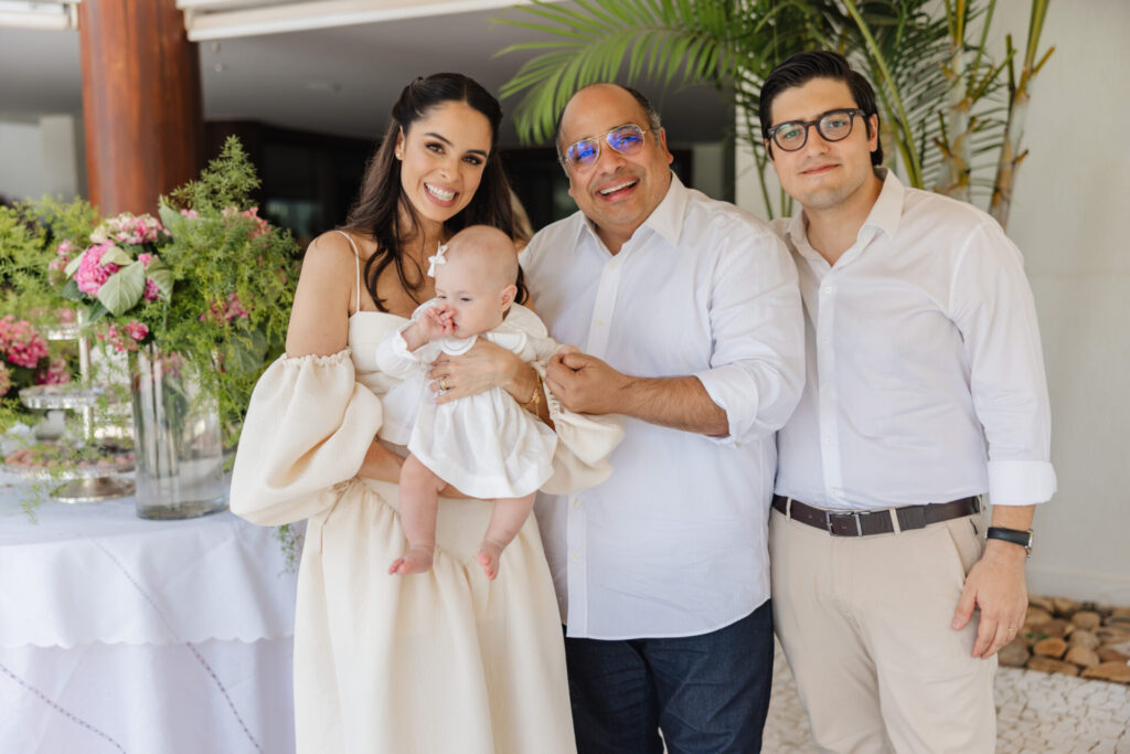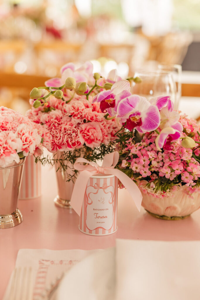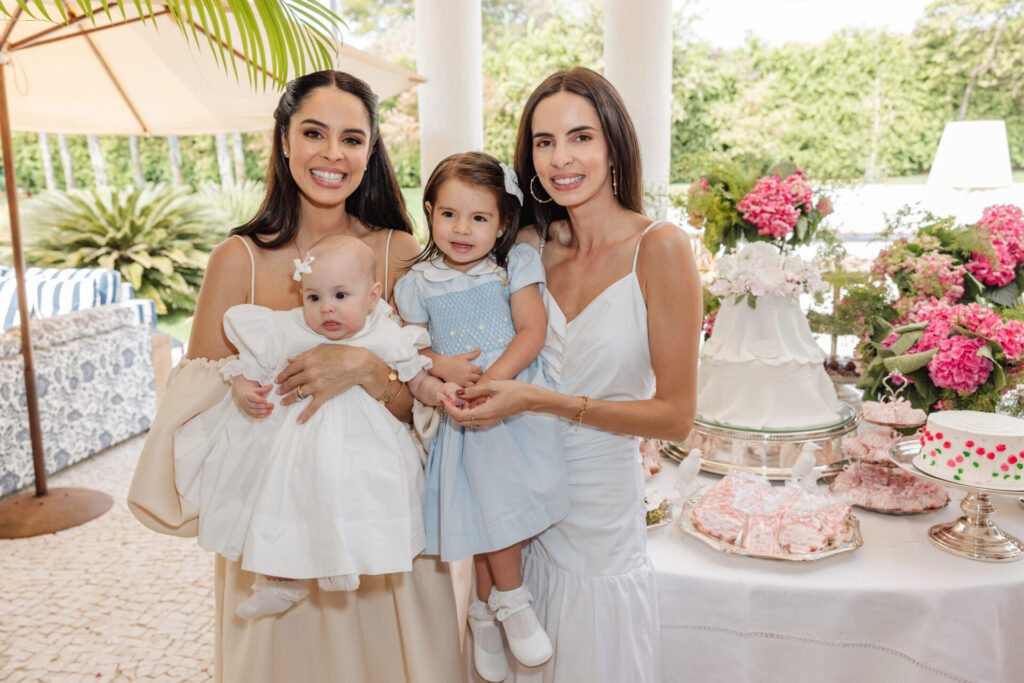 A decoração, elaborada por Maria Tereza Cavalcanti, trouxe um toque especial ao ambiente, com tons de rosa e arranjos florais. A mesa de doces, adornada com um bolo da Cake Forever e bombons de Tatiana Barros e Cirônia Doces, completou a delicadeza do dia dedicado à pequena Teresa.
