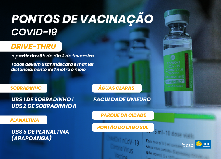 A vacinação nesses locais será exclusiva para pessoas com 80 anos ou mais. O horário de funcionamento será das 8h às 17h, sem intervalo de almoço. Os postos por drive-thru serão instalados no Parque da Cidade, no Pontão do Lago Sul, em Águas Claras na Faculdade Unieuro, na UBS 5 de Planaltina (Arapoanga – Quadra 12 D, Conjunto A, Área Especial), UBS 1 de Sobradinho I (Quadra 14, Área Especial 22/23) e UBS 2 de Sobradinho II (Rodovia DF-420, Complexo de Saúde, Setor de Mansões ao lado da UPA de Sobradinho).