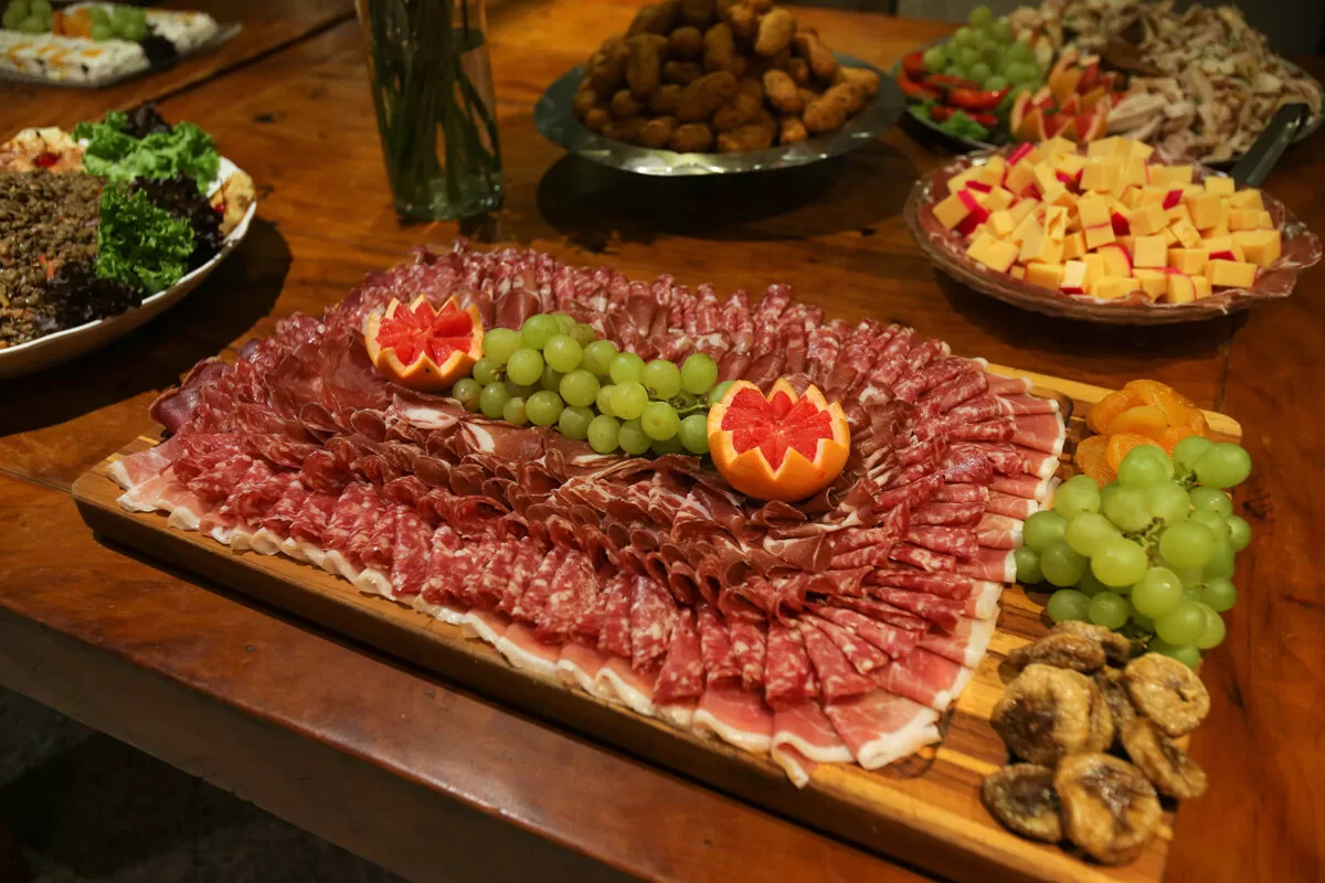 No buffet principal, a proposta segue equilibrando clássicos e receitas cheias de personalidade. Entre os pratos previstos estão bacalhau assado no azeite de oliva, filet ao molho de vinho do Porto, capelleti recheado de tomate seco com pesto cremoso de manjericão e rúcula, almôndegas de berinjela com quinoa ao molho pomodoro, além de legumes salteados, batatas ao murro e arroz branco. Para encerrar, a mesa de sobremesas promete agradar aos amantes de doces, com opções como creme de ninho com abacaxi, red velvet, banoffee, mousses de maracujá e limão, diamante negro e brigadeiro de colher.