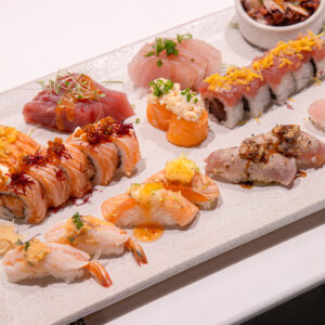 Entre os destaques gastronômicos da noite, os pratos assinados pela casa conquistaram os paladares mais exigentes. O Jyo de Camarão, uma dupla de sushi especial envolto por salmão selado e coberto por cream cheese e camarão batidinho ao molho teriyaki, encantou os presentes com sua combinação de sabores refinados. Outra estrela da noite foi o Hot Roll Gurumê, rolls de salmão empanados em flocos de cereais, cobertos de salmão batidinho, ovas de massago, cebolinha, molho teriyaki e um leve toque de azeite trufado.