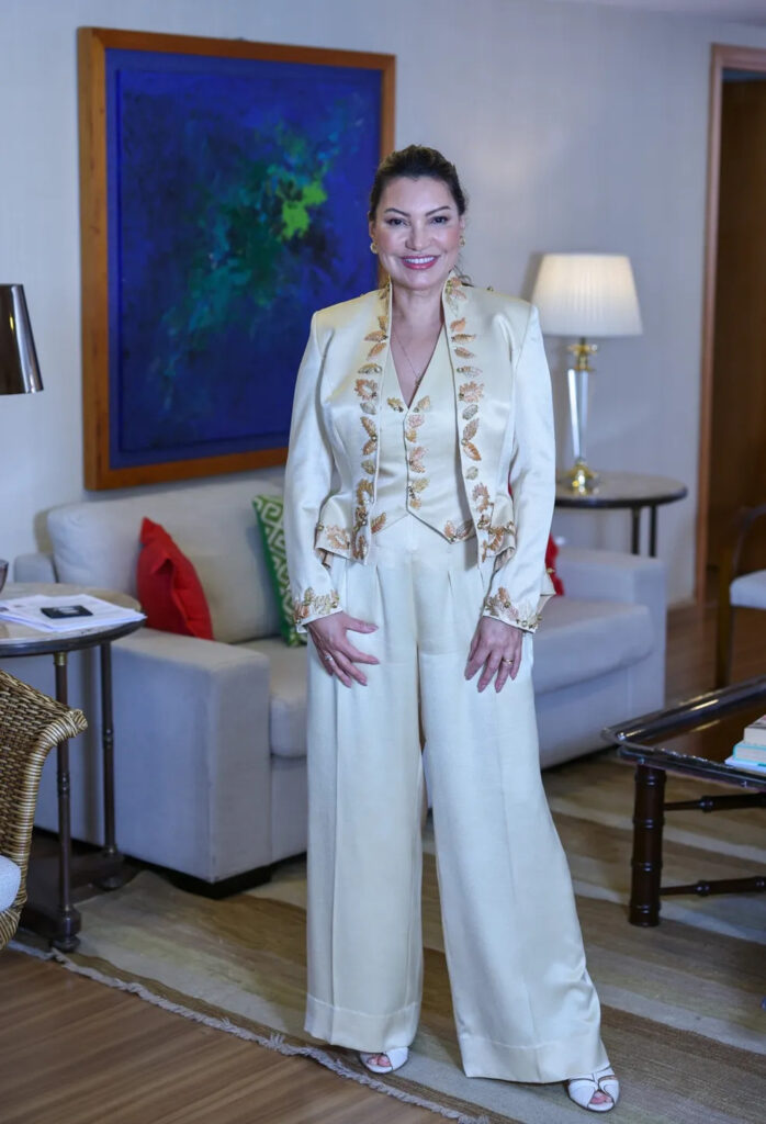 A nova primeira-dama do Brasil, Janja, elege conjunto de seda de Helô Rocha para posse de Lula. O look é em parceria com as bordadeiras de Timbaúba e com tingimento natura