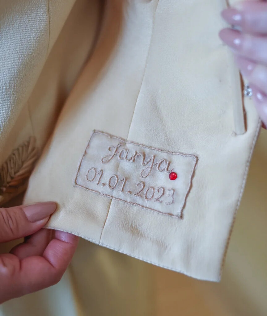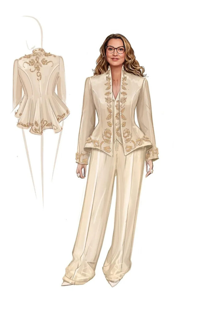 O conjunto é formado por um blazer acinturado e basque com leve cauda, usado com colete e calça pantalona de cintura alta e corsetada. Todas as peças foram feitas em crepe de seda vintage tingidas naturalmente com cajú e ruibarbo, e bordadas com palhas brasileiras. Janja optou ainda por um brinco chamado Pitanga, da marca Flavia Madeira. A beleza ficou a cargo de Jake Falchi.