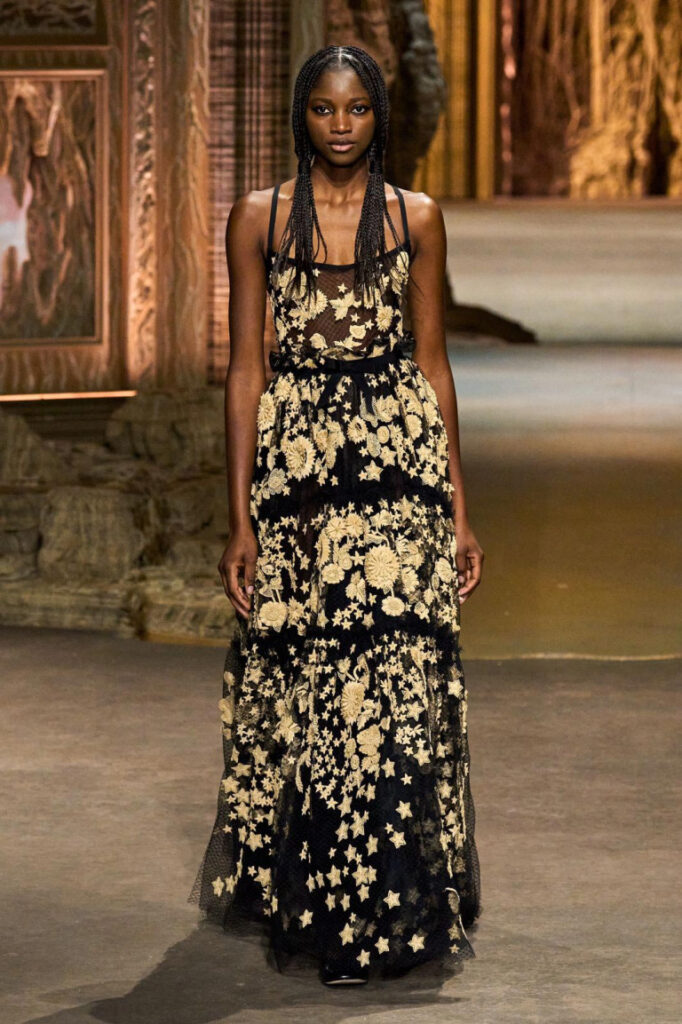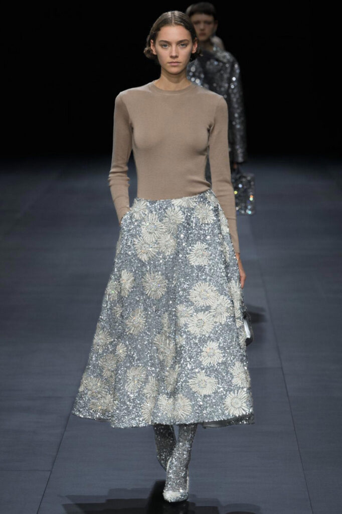 Maria Grazia Chiuri visitou os arquivos da maison e trouxe a estampa mapa de Paris, dos anos 50, além de apostar nos bordados. “Na passarela da Dior, podemos notar o uso da pintura de agulha – uma das técnicas mais sofisticadas de bordado – com fio de seda em algumas peças. Além disso, também foi possível ver bordados em diferentes superfícies e tecidos como: tafetá, malhas de tricô, telas e ráfia, e até sapatos bordados. Todos produzidos pelo atelier francês Vermont e o indiano Chanakya”, comenta Natália Rios, designer brasileira formada pela École Lesage.