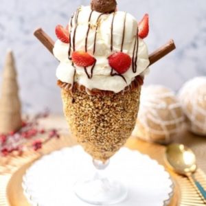 Stonia Ice Creamland – Avalanche (gelato Stonia, brigadeiro de colher, amendoim e castanha de caju, borda de doce de leite, brigadeiro branco, brownie, Kit Kat, Nutella, morangos frescos, Ferrero Rocher ou Kinder Bueno), por R$ 54,00, que serve quatro pessoas.