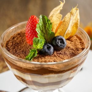 Sallva Bar & Ristorante – Tiramissú (corte em camadas de biscoitos de champagne embebidos em café e licor, com creme de mascarpone e finalizadas com cacau em pó, R$ 37,00.