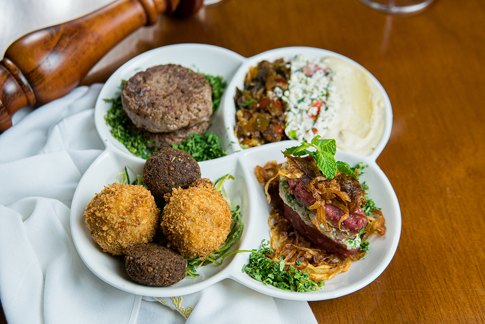No Empório Árabe Restaurante, o cardápio começa com uma entrada, para compartilhar, o Mix do Oriente, composto por Torre de Texturas (kibe cru, coalhada seca, tabule, chips de cebola negra e torradas de pão folha), falafel (bolinho de grão-de-bico), homus (pasta de grão-de-bico), chancliche, caponata e pão árabe.